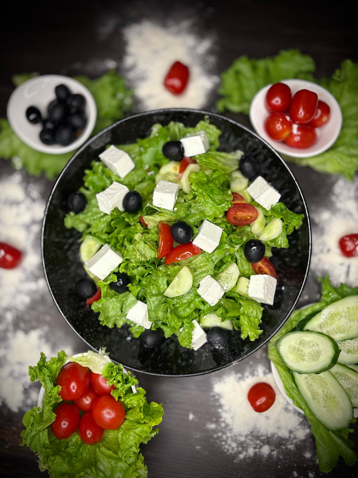 კიტრი,პომიდორი,აისბერგი,ყველი ფეტა,ზეთისხილი