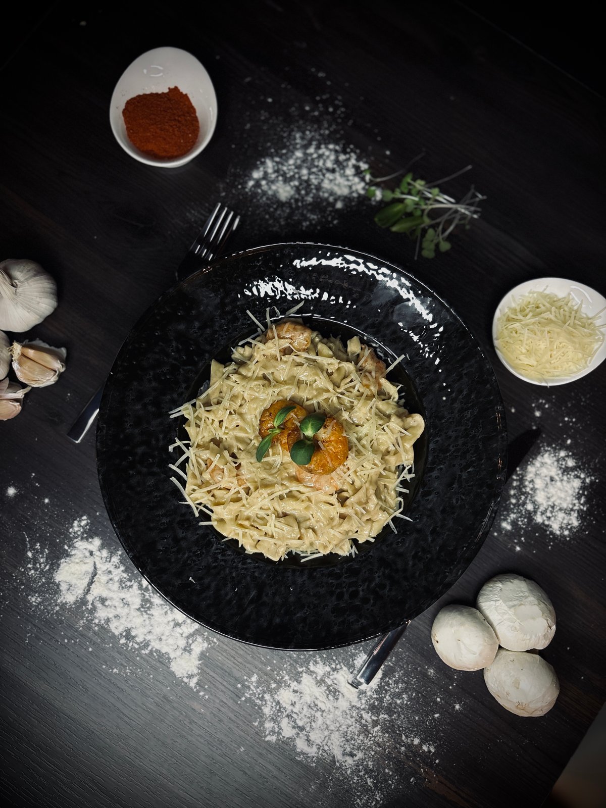 ლორი,სოკო,პარმეზანი,ნაღები,მარილი,პილპილი,ცომი