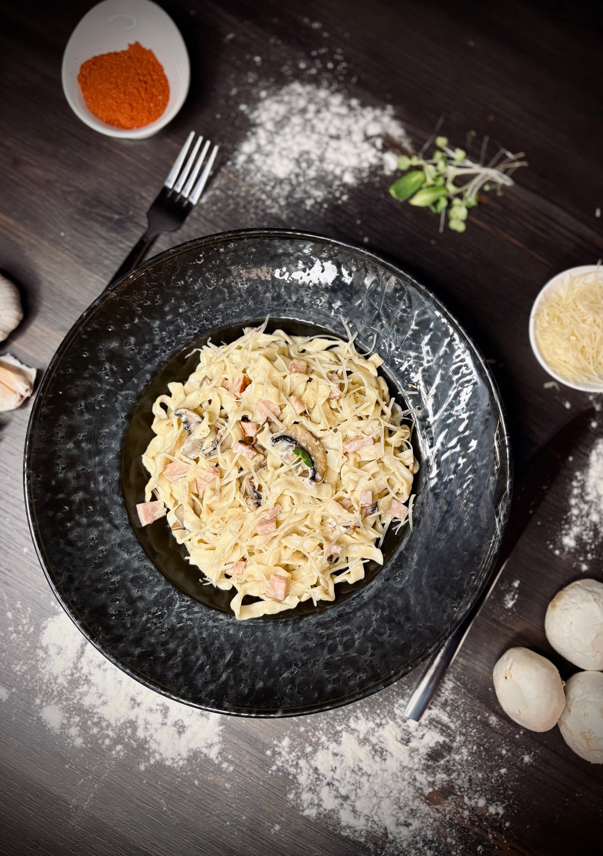 ბეკონი,პარმეზანი,კვერცხი, ნაღები,პილპილი ,მარილი,ცომი