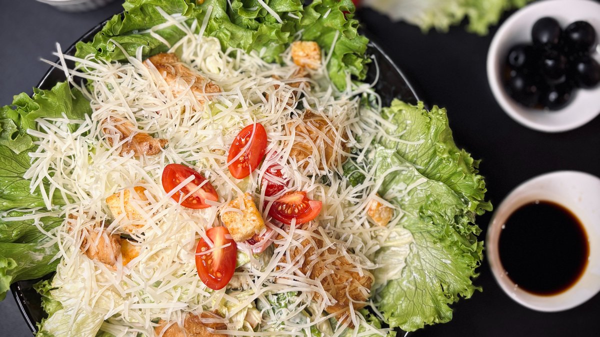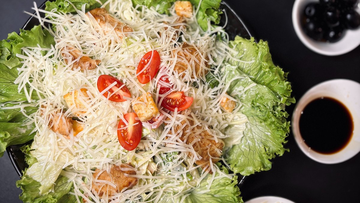 აისბერგი,ჩერი პომიდორი,პარმეზანი,ქათამი,დრესინგი,კროტონები