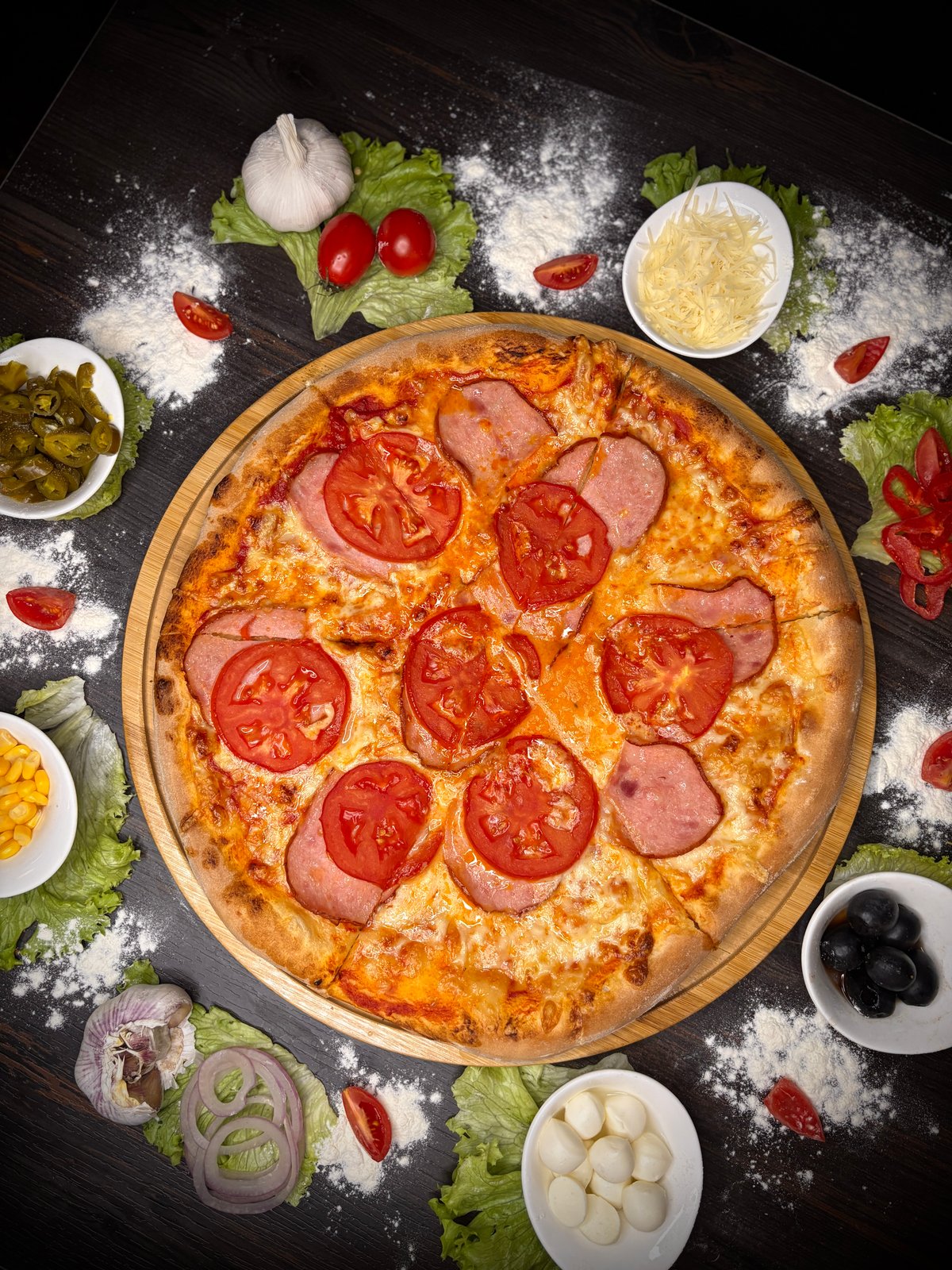 8 ნაჭერი ლორი, პომიდორი, მოცარელა, პიცის ცომი,მარინარა