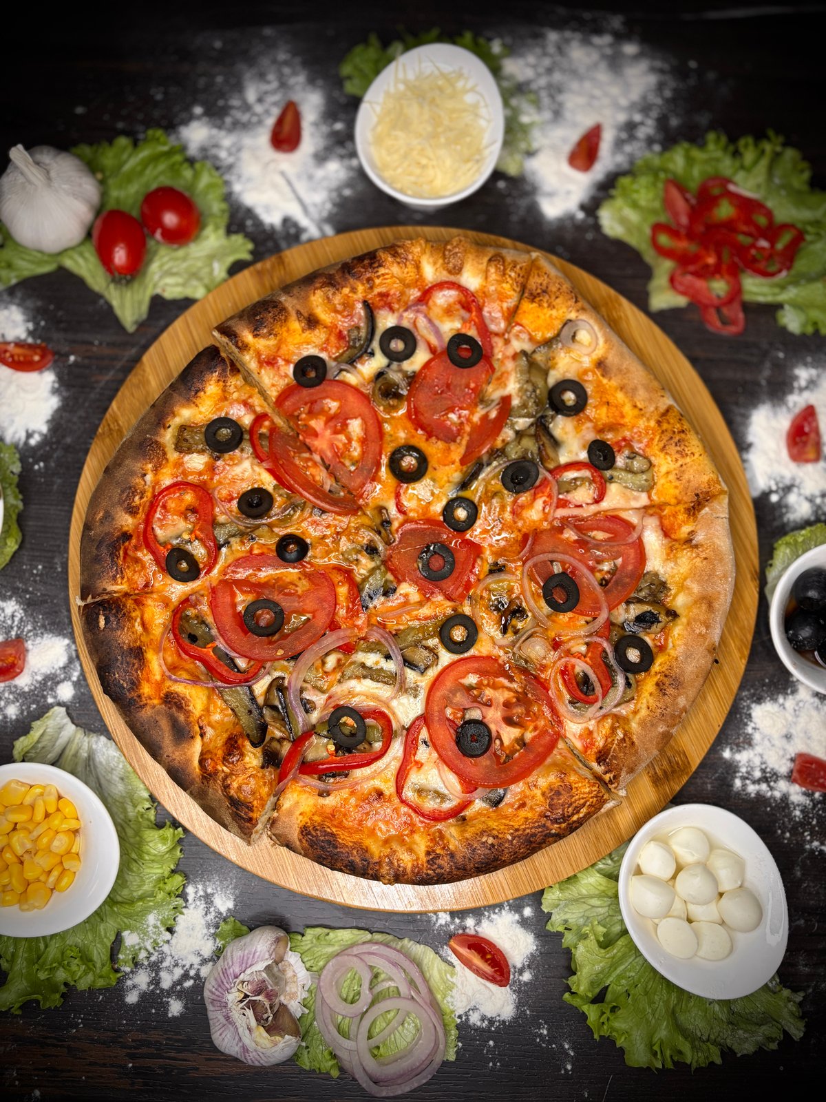 8 ნაჭერი პეპერონი, ხახვი, ბულგარული, სიმინდი, ჰალაპენიო,ზეთისხილი, ორეგანო, პიცის ცომი, მარინარა, მოცარელა.