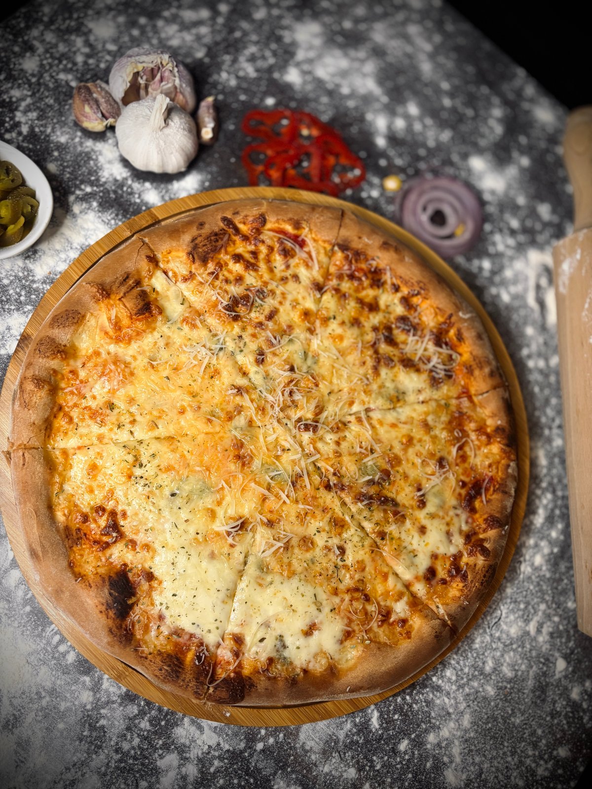 8 ნაჭერი მოცარელა, გაუდა, პარმეზანი, ლურჯი ყველი, ორეგანო, პიცის ცომი, მარინარა.