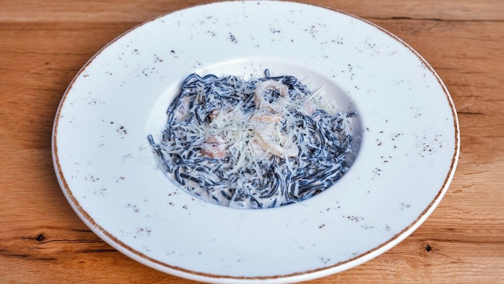 Black spaghetti, bechamel sauce, mushrooms, parmesan, garlic, herbs, olive oil (375g)