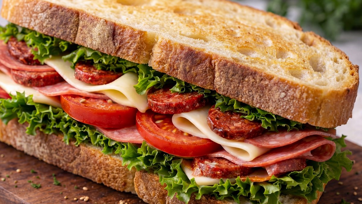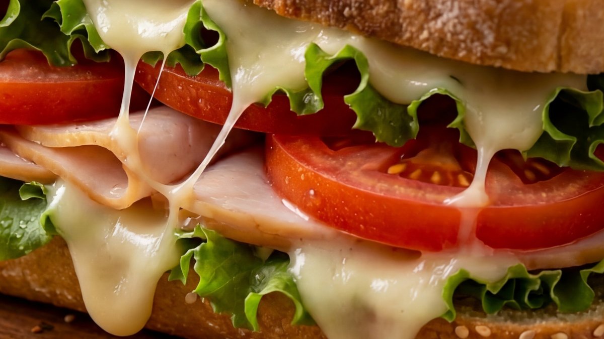 Sesame baguette with cheese, turkey, lettuce and tomatoes.