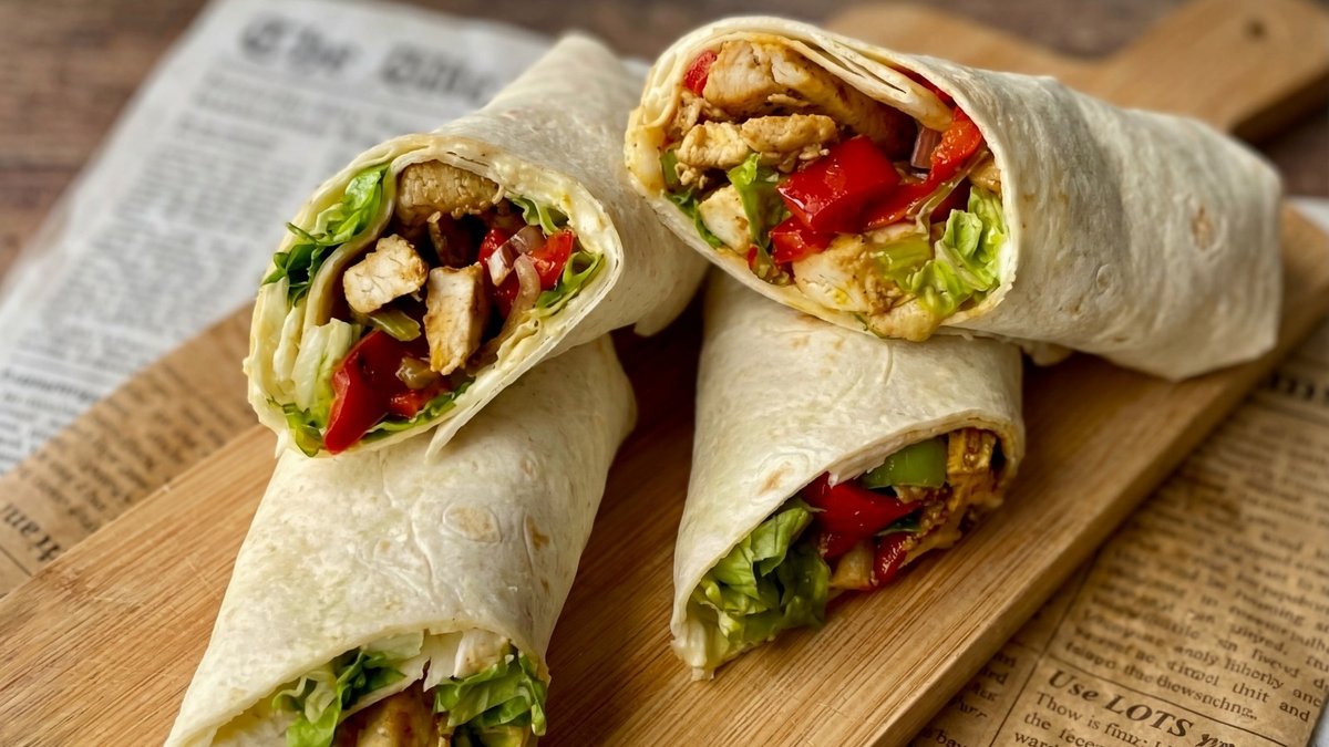 Savory crepe wrap filled with grilled chicken, lettuce and peppers