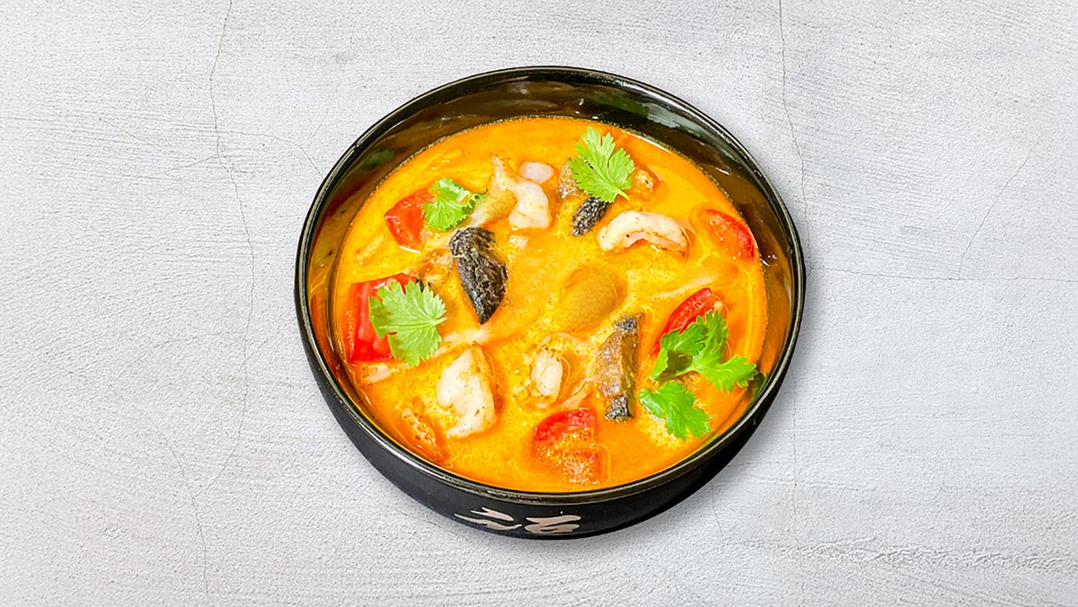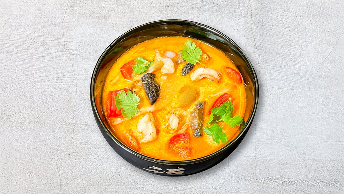 კრევეტები, მიდიები, კალმარი, შიიტაკე, პომიდორი, ქინძი, ქოქოსის რძე, ნაღები, ლემონგრასი + ბრინჯი