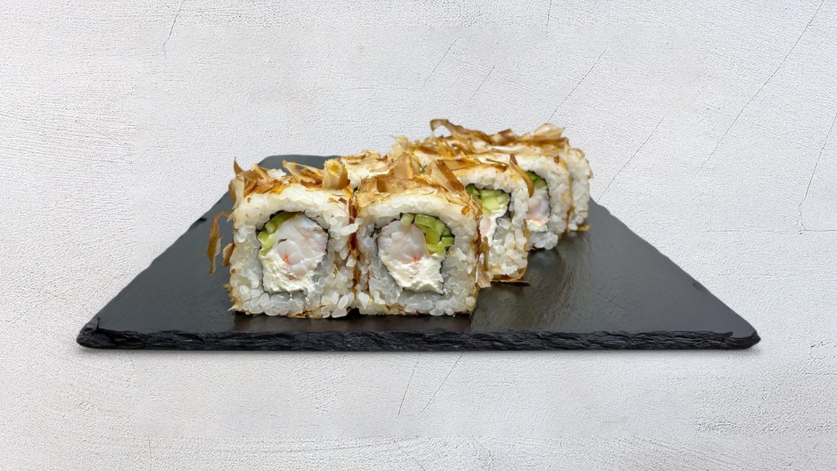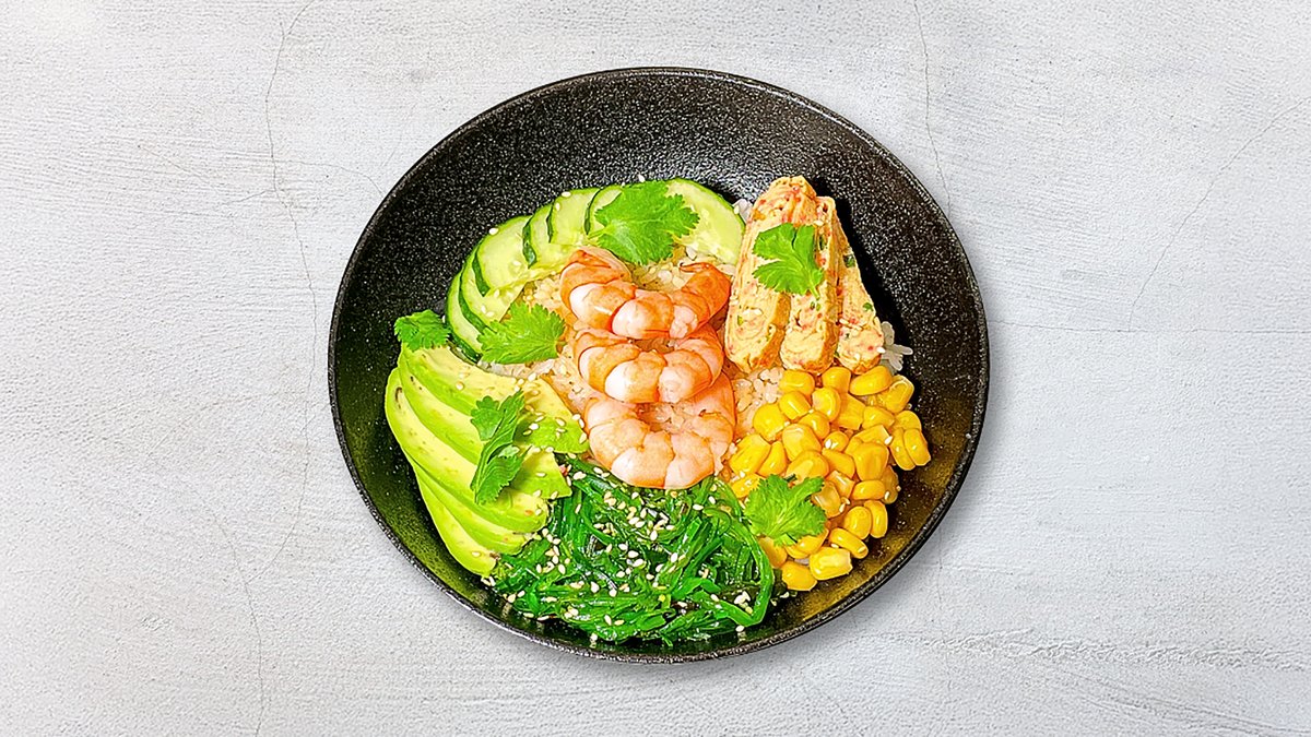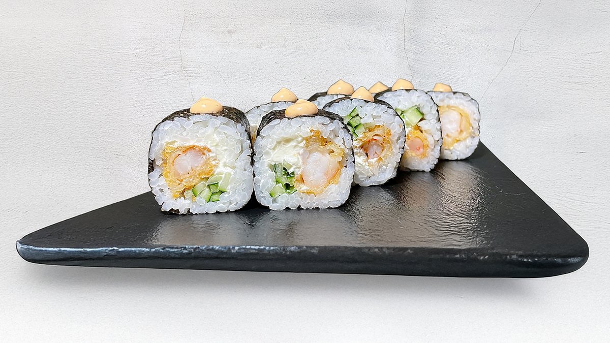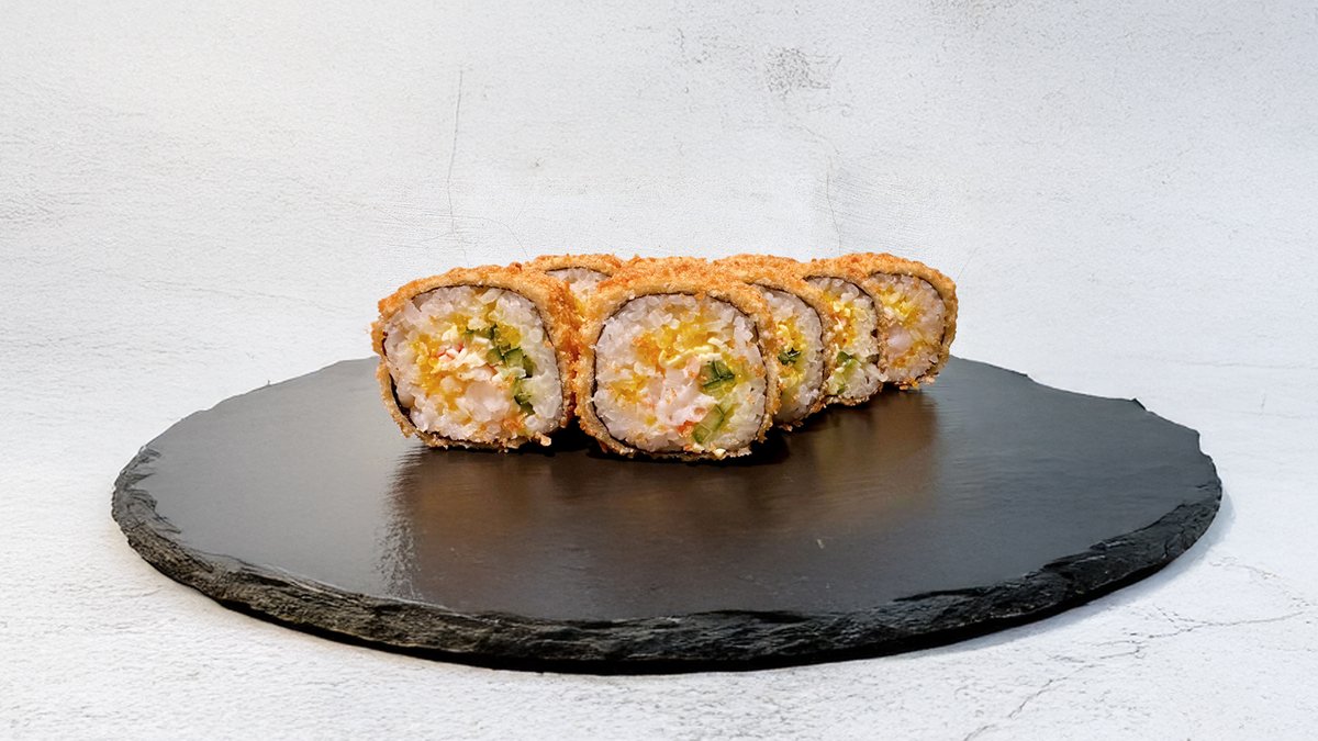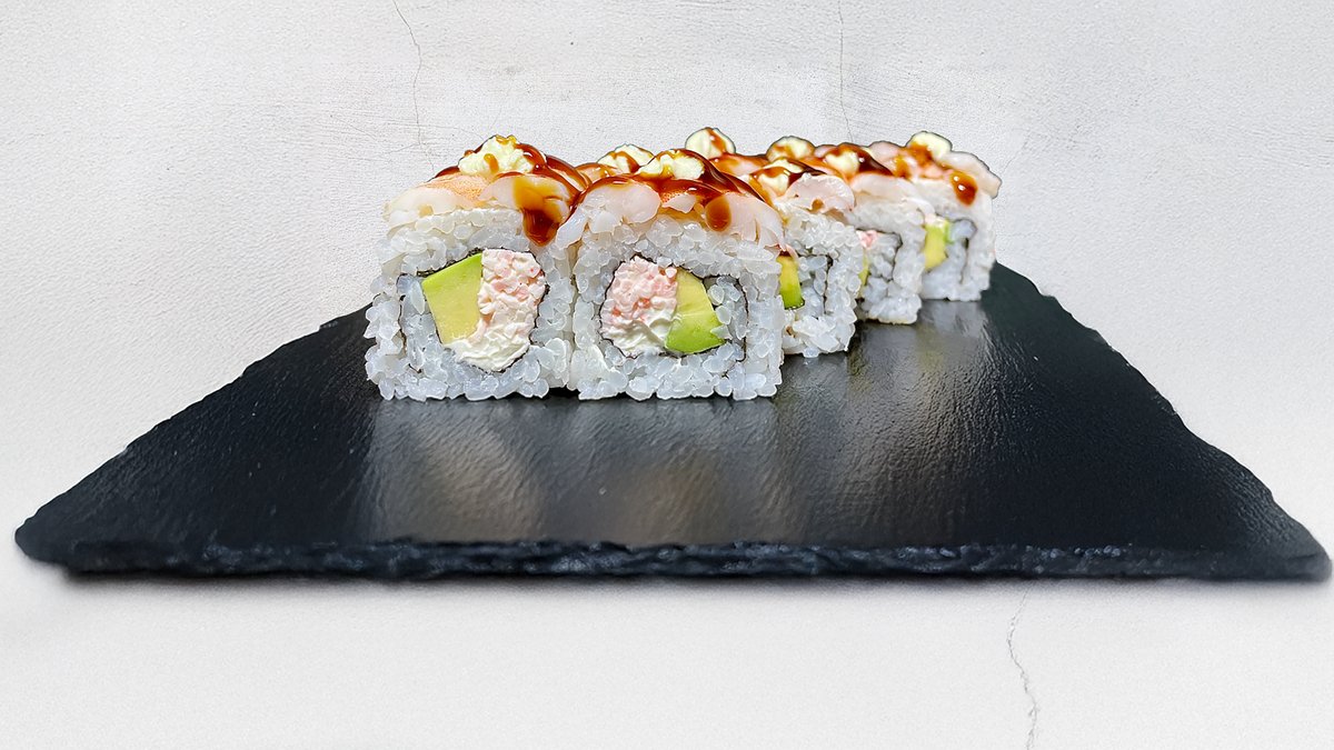 კრევეტი, იაპონური ომლეტი, ავოკადო, კიტრი, ჩუკა, სოიოს სოუსი, სიმინდი, სეზამი, ტკბილ-ცხარე სოუსი, ქინძი, ბრინჯი