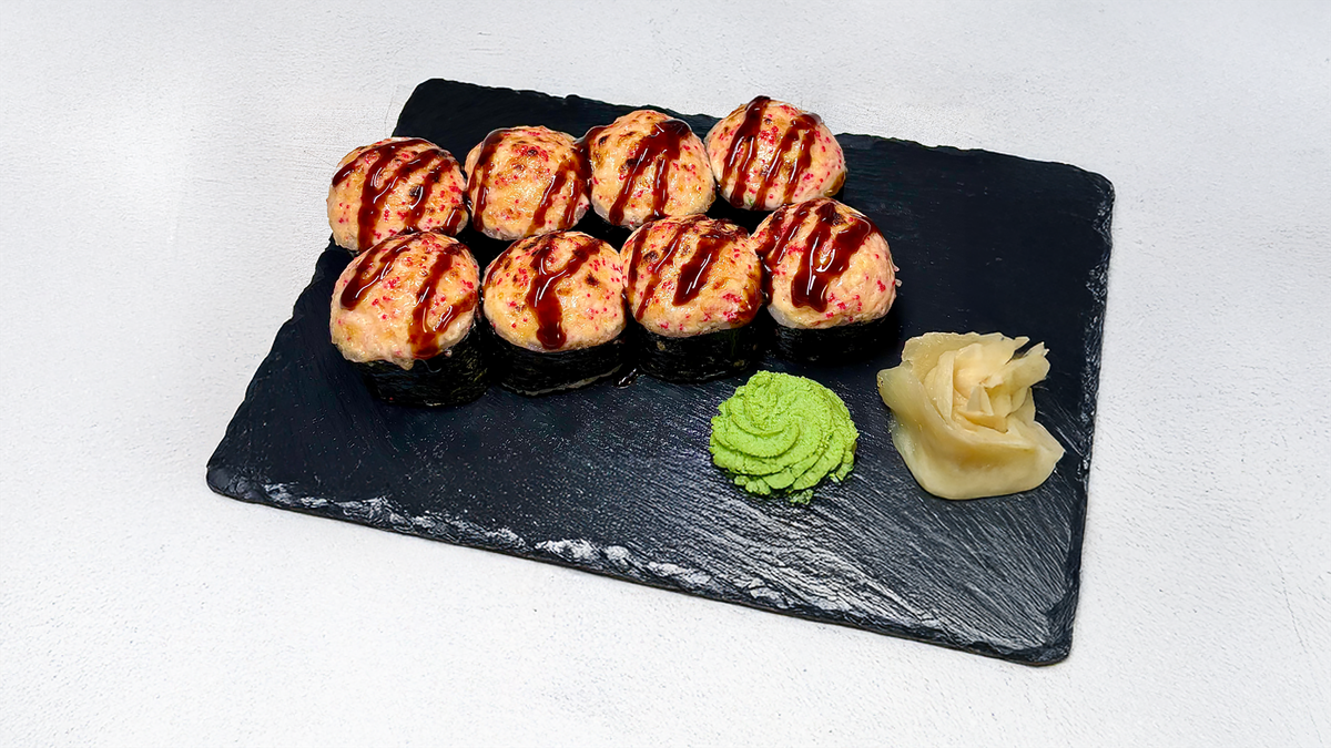 სფაისი თინუსის როლი, ფილადელფია გველთევზით, კალიფორნია თოვლის კრაბი, ბონიტო კრევეტით, როლი ტემპურული კრევეთებით. ჯინჯერი, ვასაბი, სოიოს სოუსი