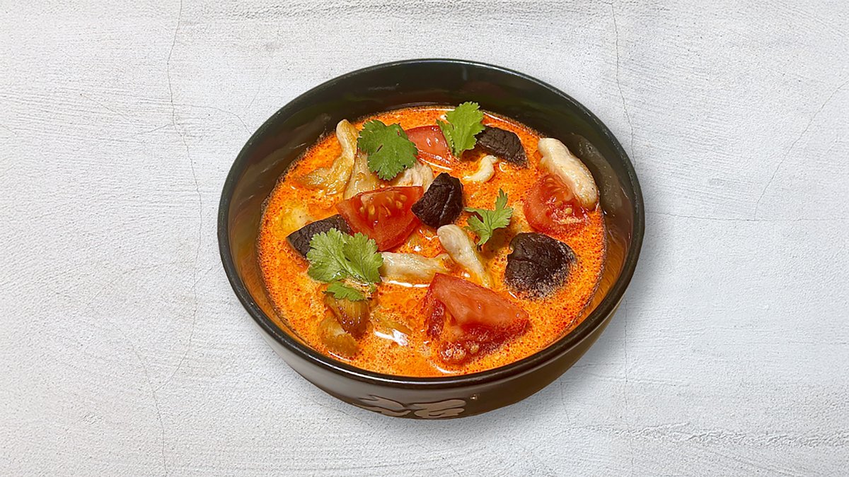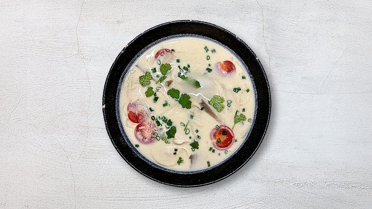 ტაილანდური წვნიანი ქოქოსის რძითა და ნაღებით, ქათმის ხორცით, სოკოთი და ბოსტნეულით