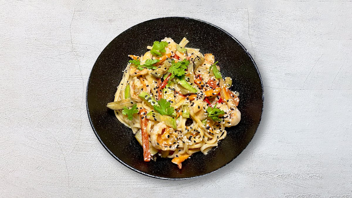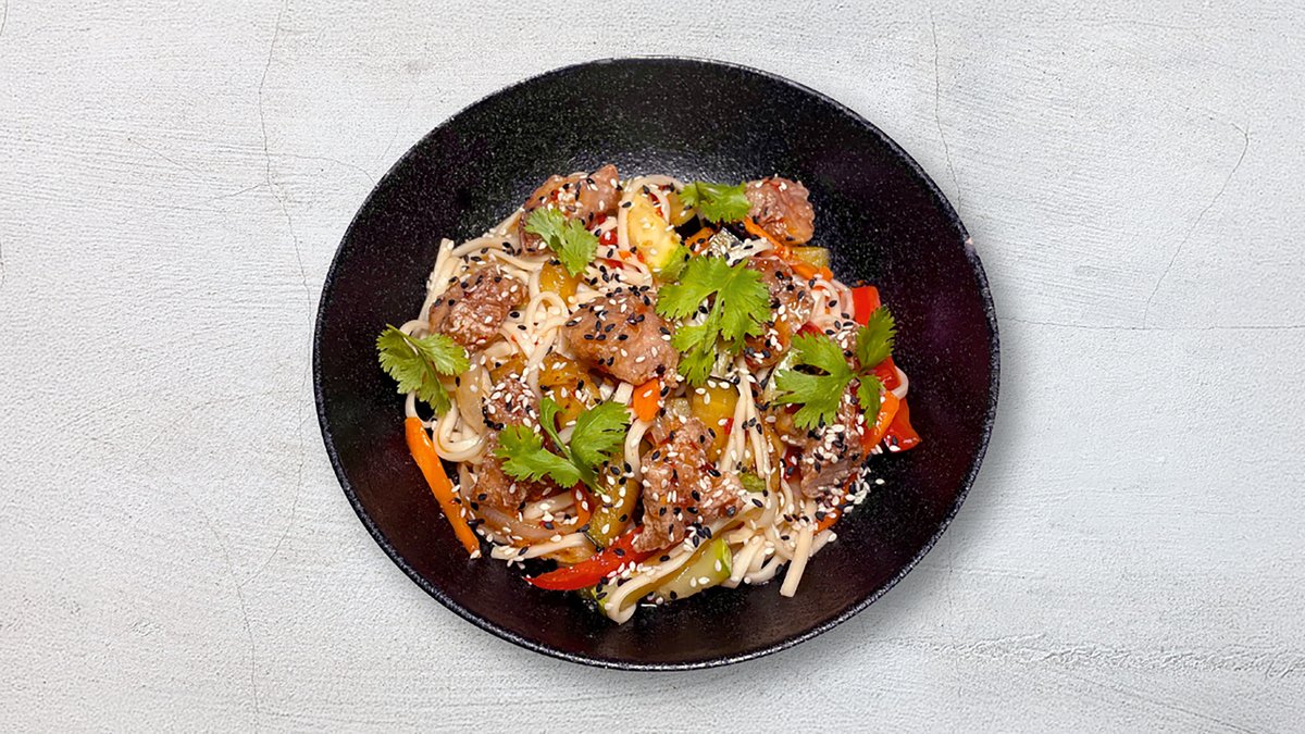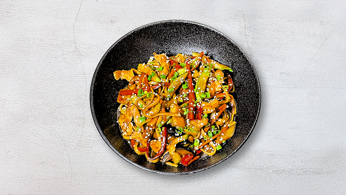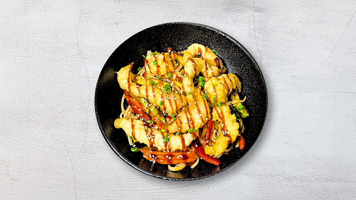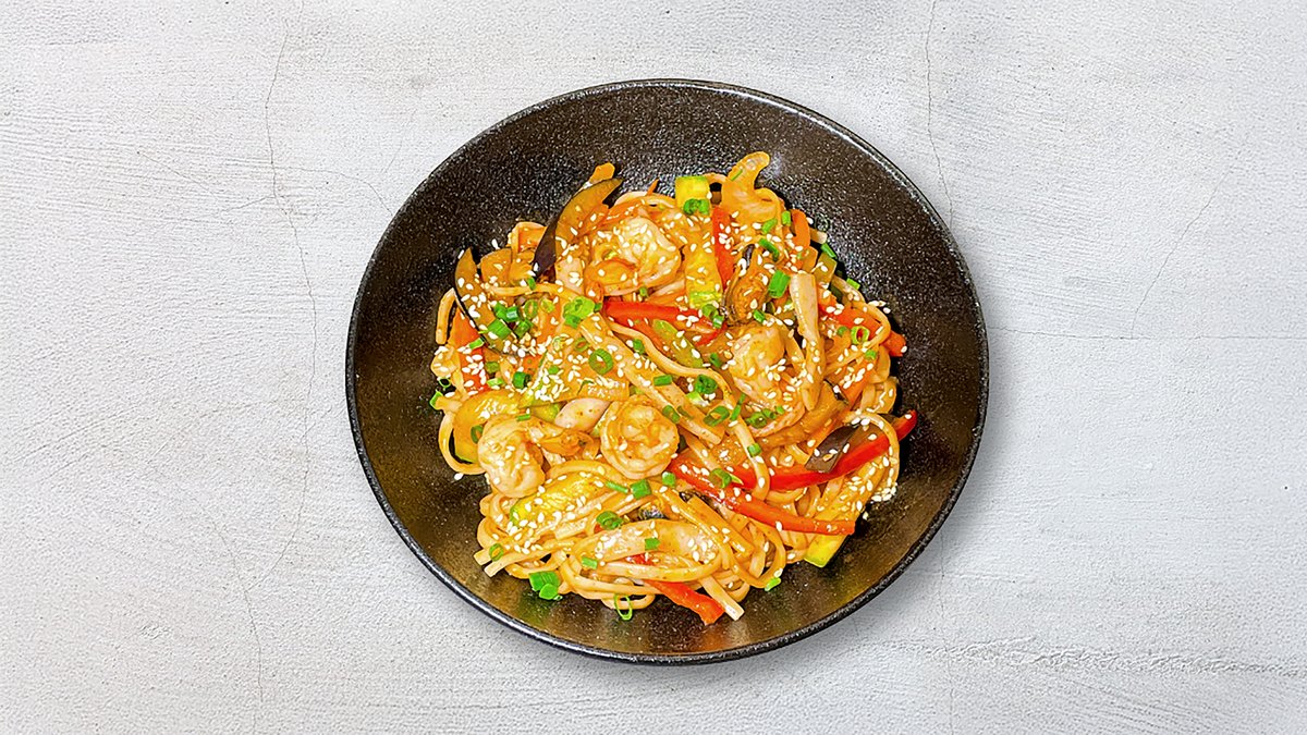 უდონის ლაფშა, ყაბაყი, ბადრიჯანი, ბულგარული, ხახვი, სტაფილო, ტკბილ მჟავე სოუსი, სეზამი, მწვანე ხახვი