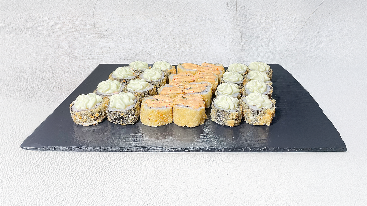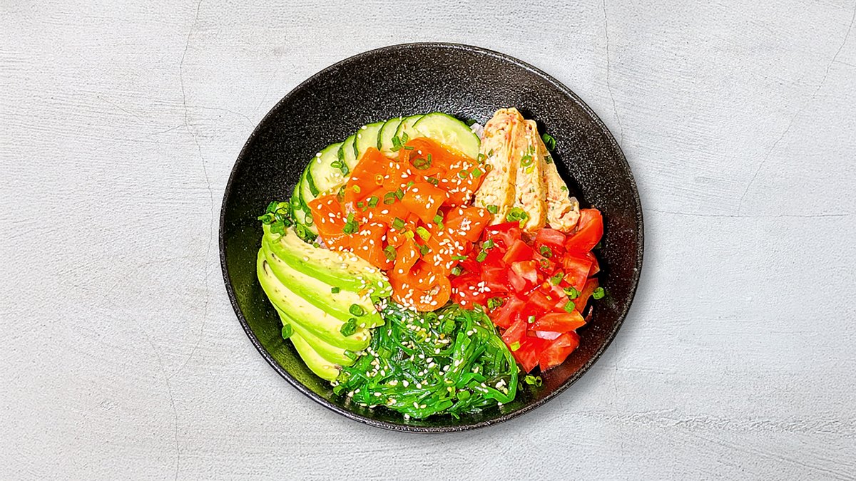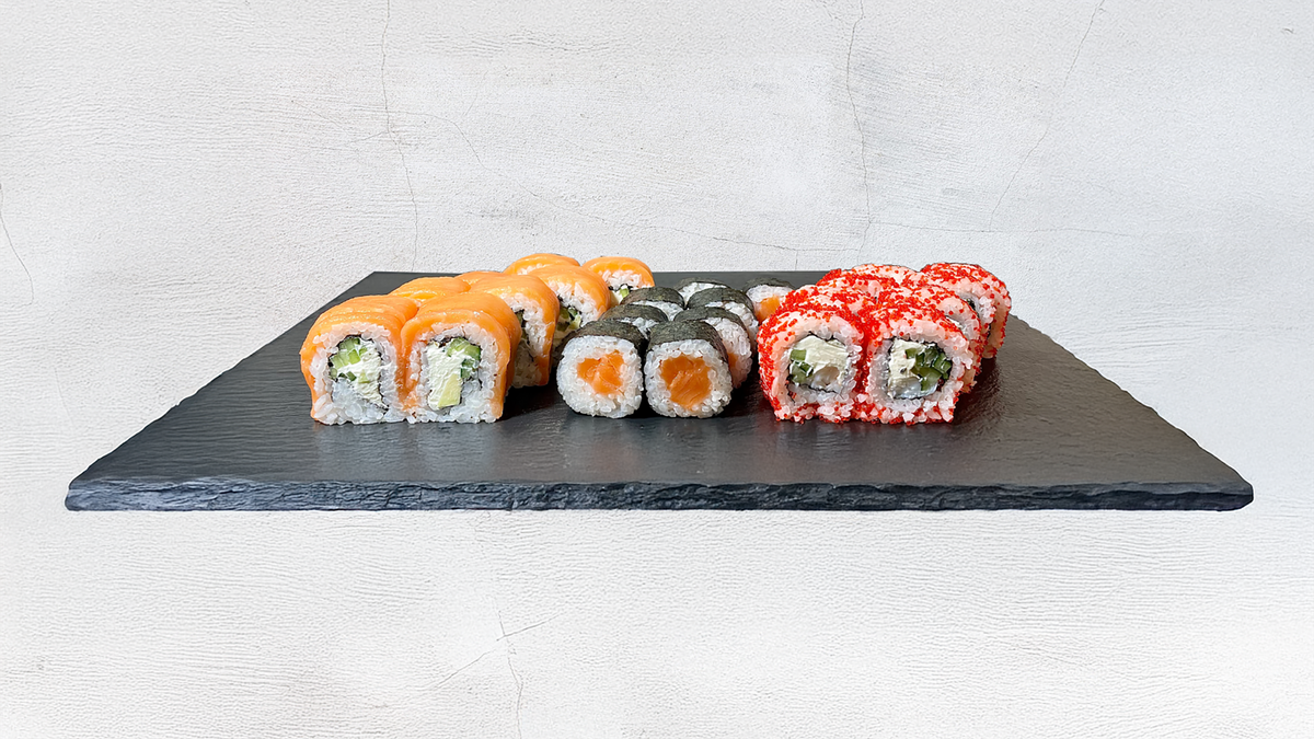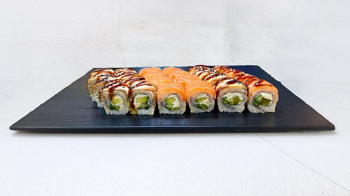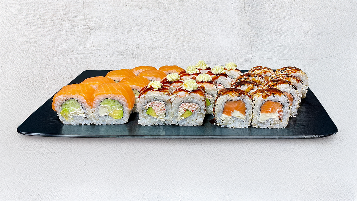 ორაგული, იაპონური ომლეტი, ავოკადო, პომიდორი, ჩუკა, კიტრი, ტკბილ-ცხარე სოუსი, ბრინჯი, სოიოს სოუსი, სეზამი, მწვანე ხახვი