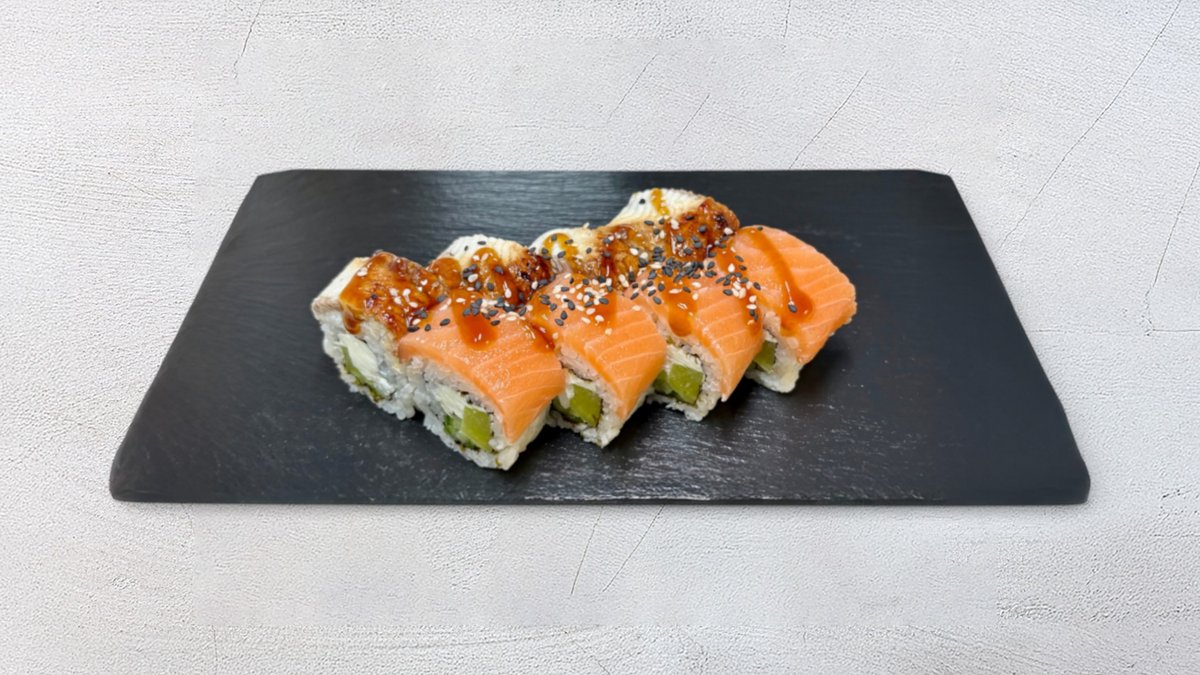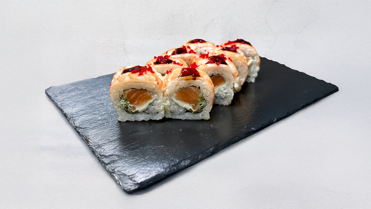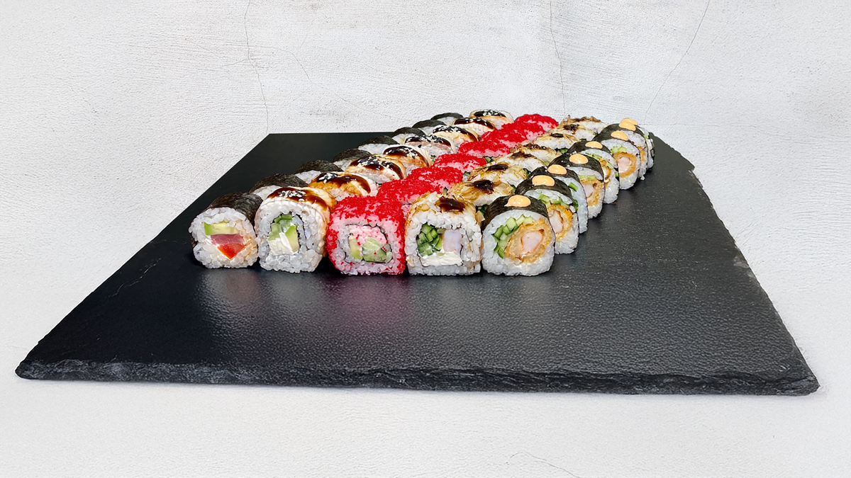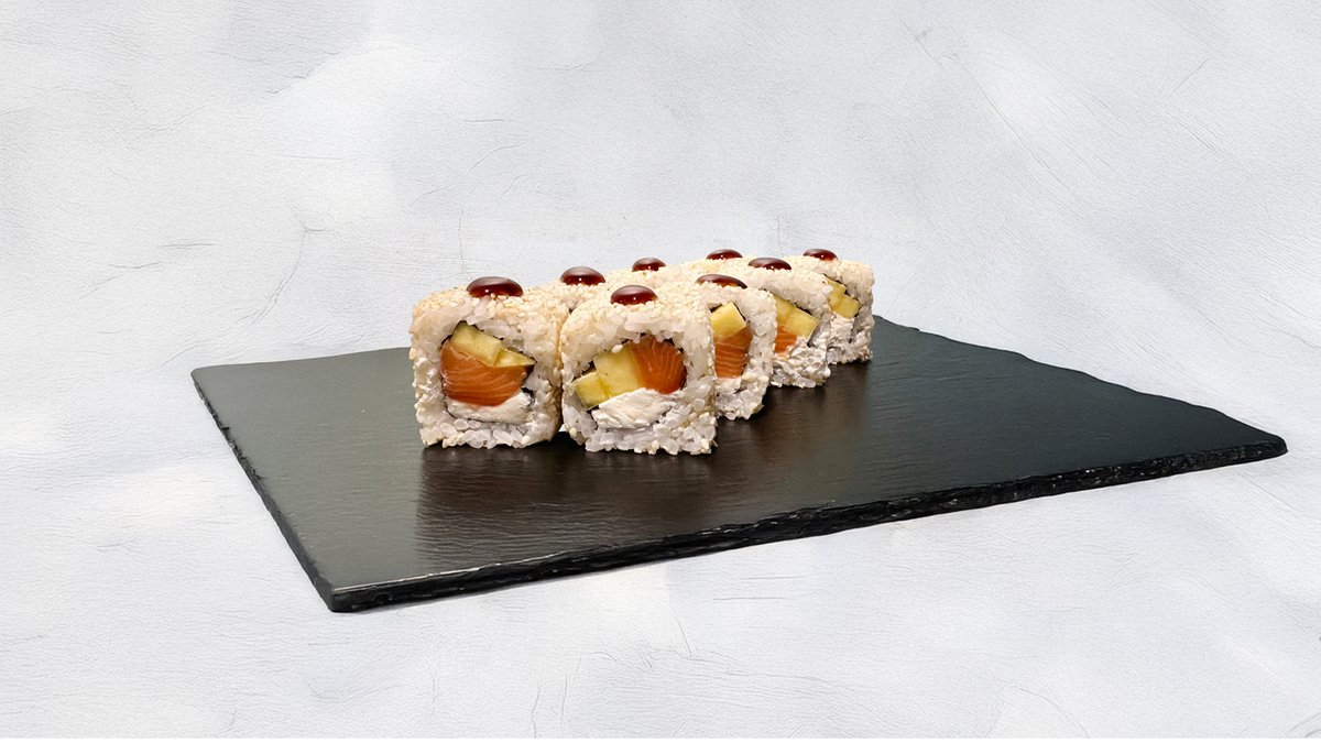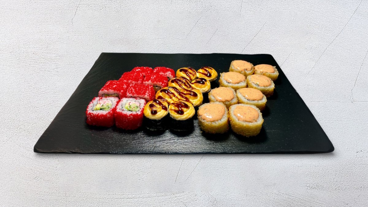 ორაგული, იაპონური ომლეტი, ავოკადო, პომიდორი, ჩუკა, კიტრი, ტკბილ-ცხარე სოუსი, ბრინჯი, სოიოს სოუსი, სეზამი, მწვანე ხახვი