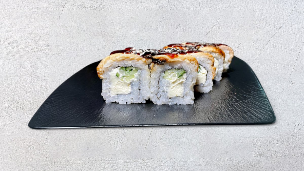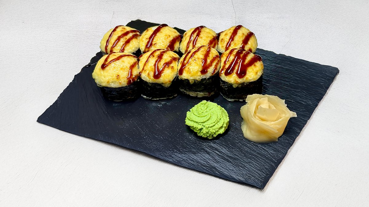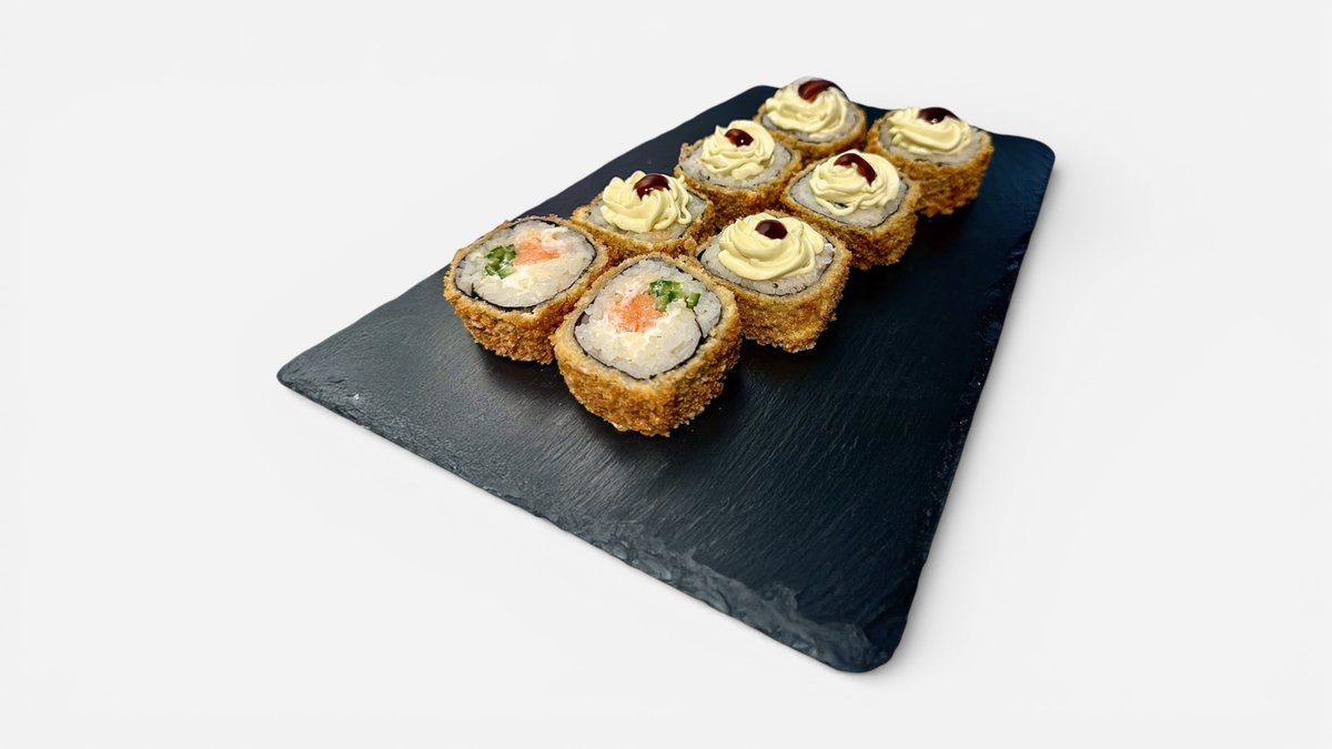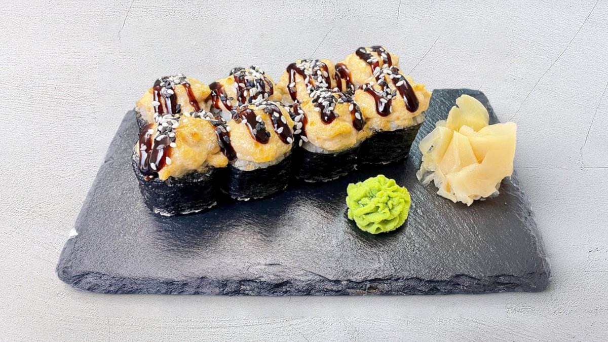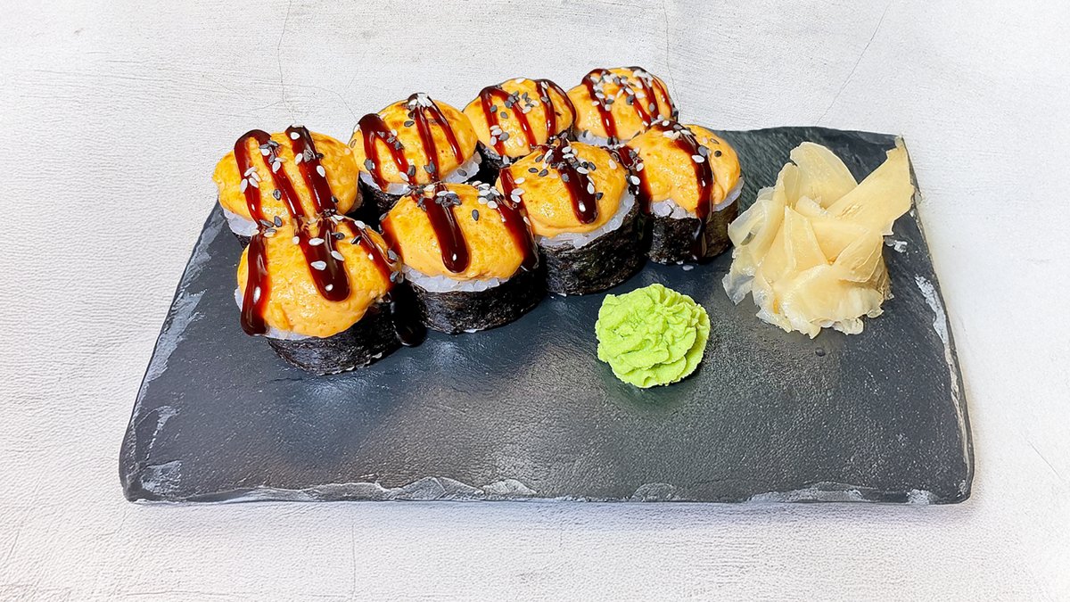 როლი კრევეტით, კრემ ყველით, კიტრი და პომიდვრით, ზემოდან გამომცხვარი აიაში სოუსით. ჯანჯაფილი, ვასაბი, სოიოს სოუსი