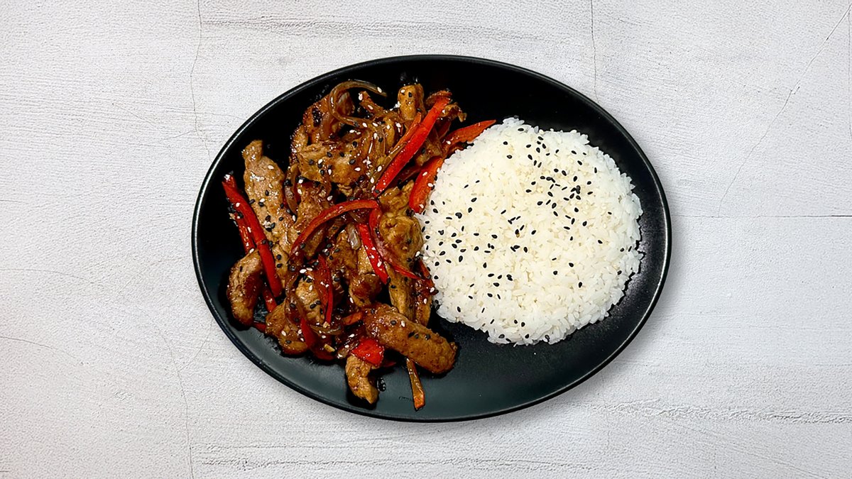 ღორის ხორცი, ბრინჯი, ბულგარული წიწაკა, სტაფილო, ხახვი, ნიორი, სეზამის მარცვლები