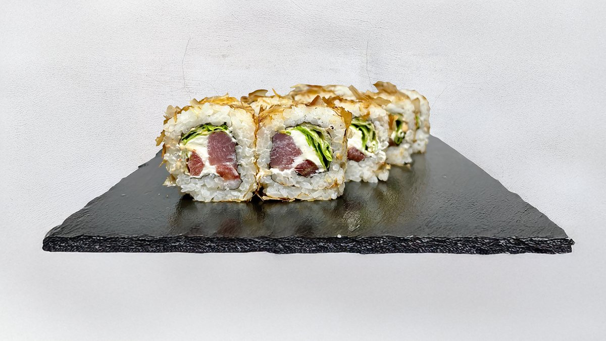 ბრინჯი, ნორი, თინუსი, თინუსის ფანტელები, კრემ-ყველი, პომიდორი, აისბერგის სალათის ფოთოლი, სფაისი სოუსი. ჯინჯერი, ვასაბი, სოიოს სოუსი