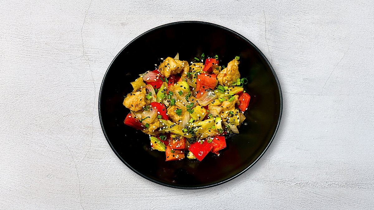 ქათამი, ბულგარული წიწაკა, ყაბაყი, ხახვი, ბროკოლი, მწვანე ხახვი, სეზამის მარცვლებ