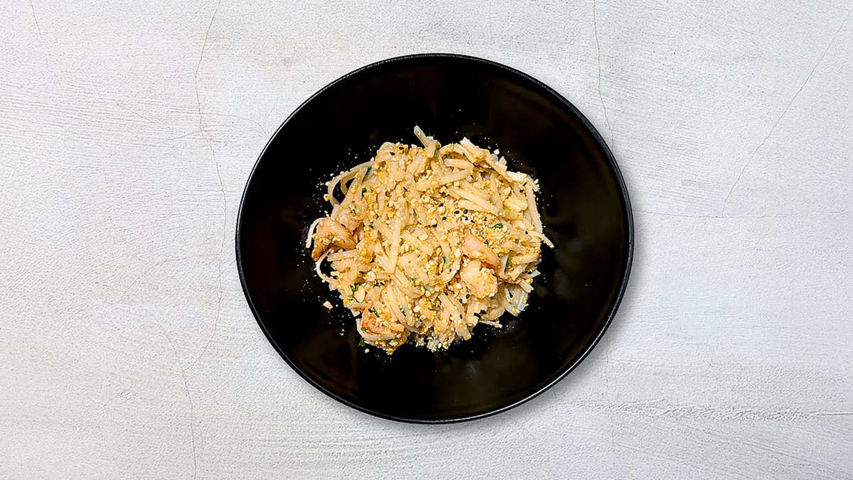 კრევეტები, ბრინჯის ლაფშა, კვერცხი, ნიორი, მწვანე ხახვი, ლაიმი, მიწის თხილი