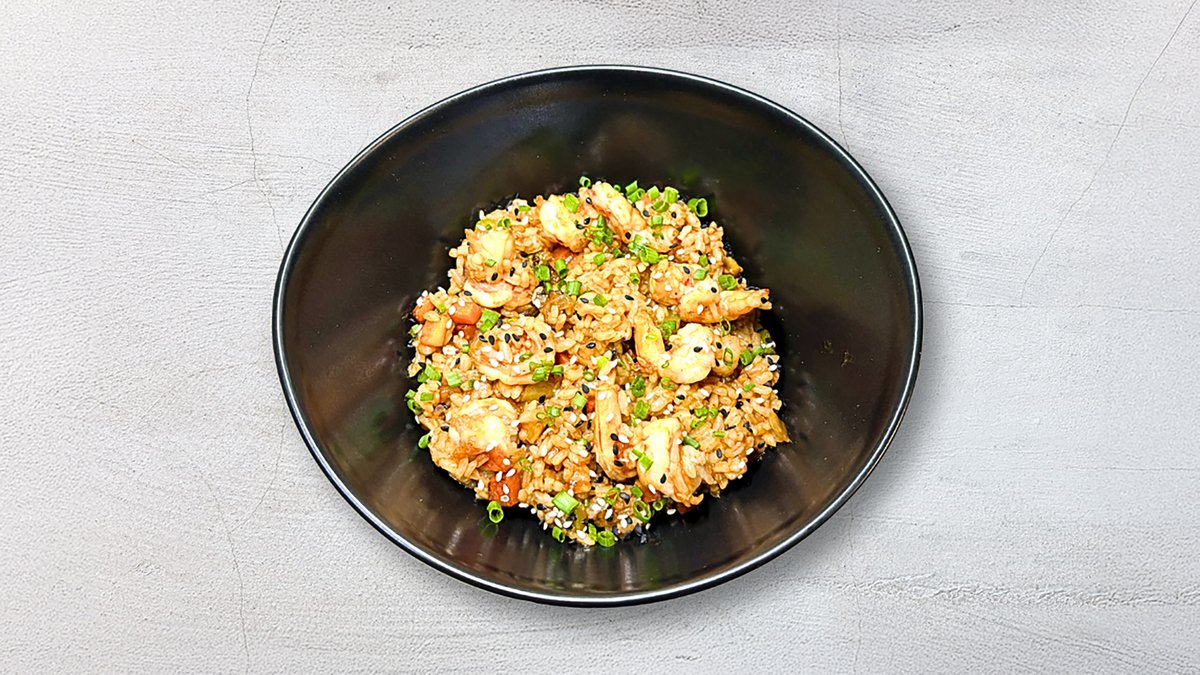 კრევეტები, შემწვარი ბრინჯი, სტაფილო, ხახვი, ბადრიჯანი, ყაბაყი, ცხარე სოუსი, სეზამი, მწვანე ხახვი