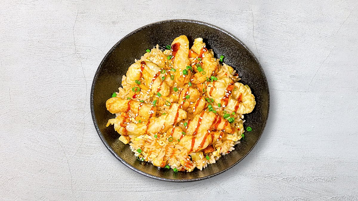 ბრინჯი, ქათამი, კამა, იაპონური ომლეტი, ხახვის ფრი, ნორი