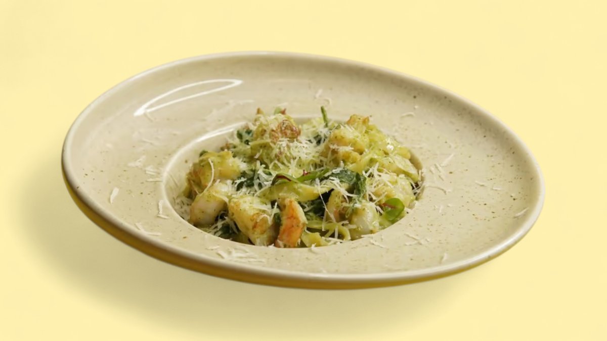 Savor our breakfast Fettuccine pasta, richly loaded with succulent grilled shrimps, sрpinach, creamy cashew sauce, parmesan and fresh microgreens.