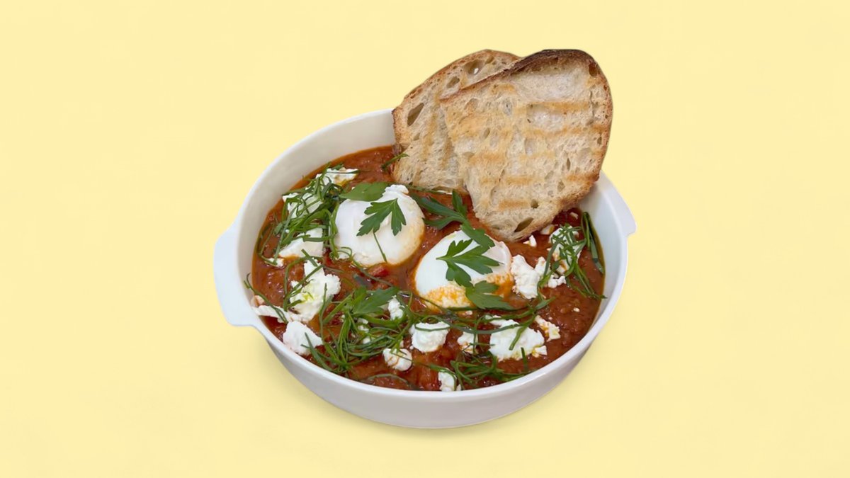 spicy tomato sause, bell papper, two poashed eggs, feta cheese, greens, tartine bread