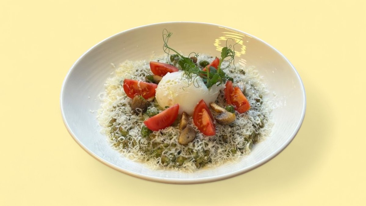 Kickstart your day with our nutritious creamy buckwheat topped with parmesan, a flawlessly poached egg, and crisp fresh veggies. Perfect morning meal!