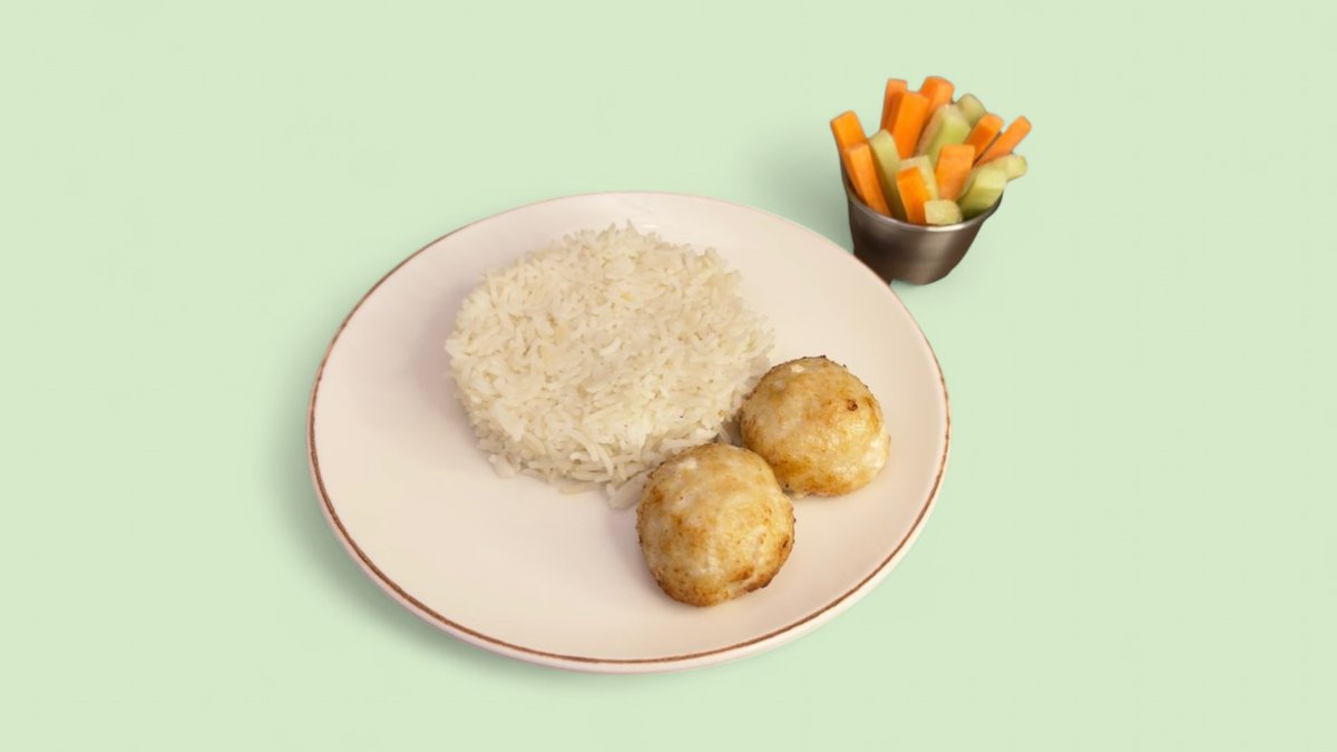 Fish meatballs with rice, creamy coconut sauce with broccoli, shpinach and green peas.