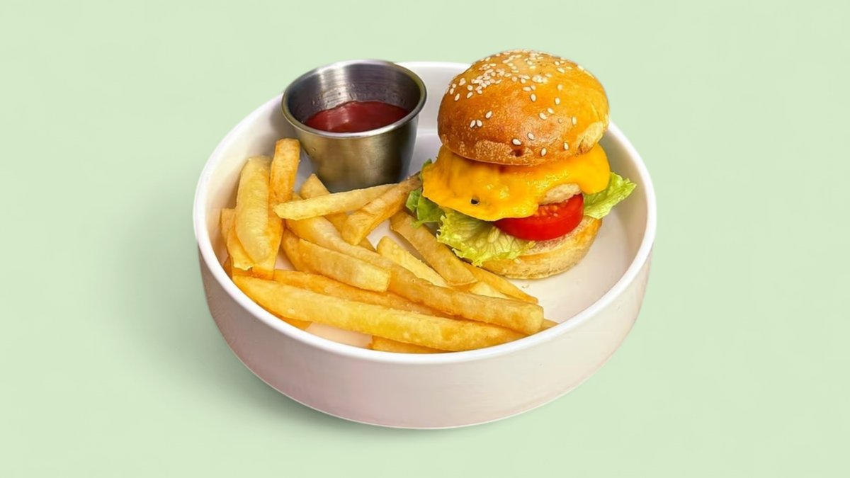 chicken patty, lettuce, tomato, cheddar cheese, ketchup