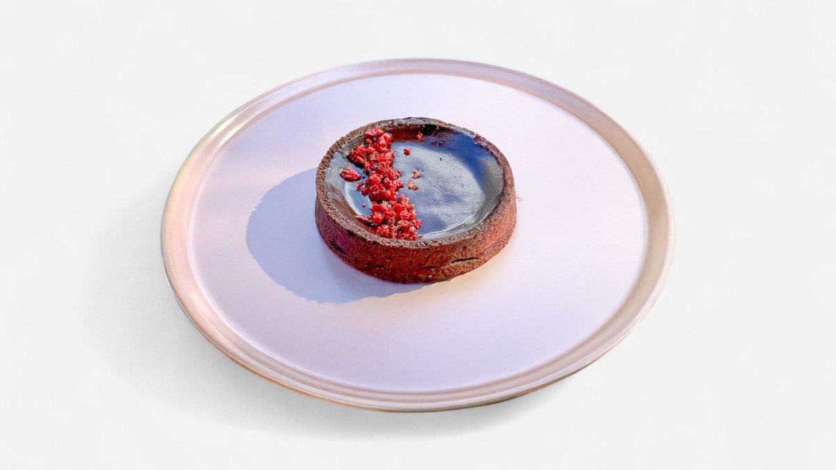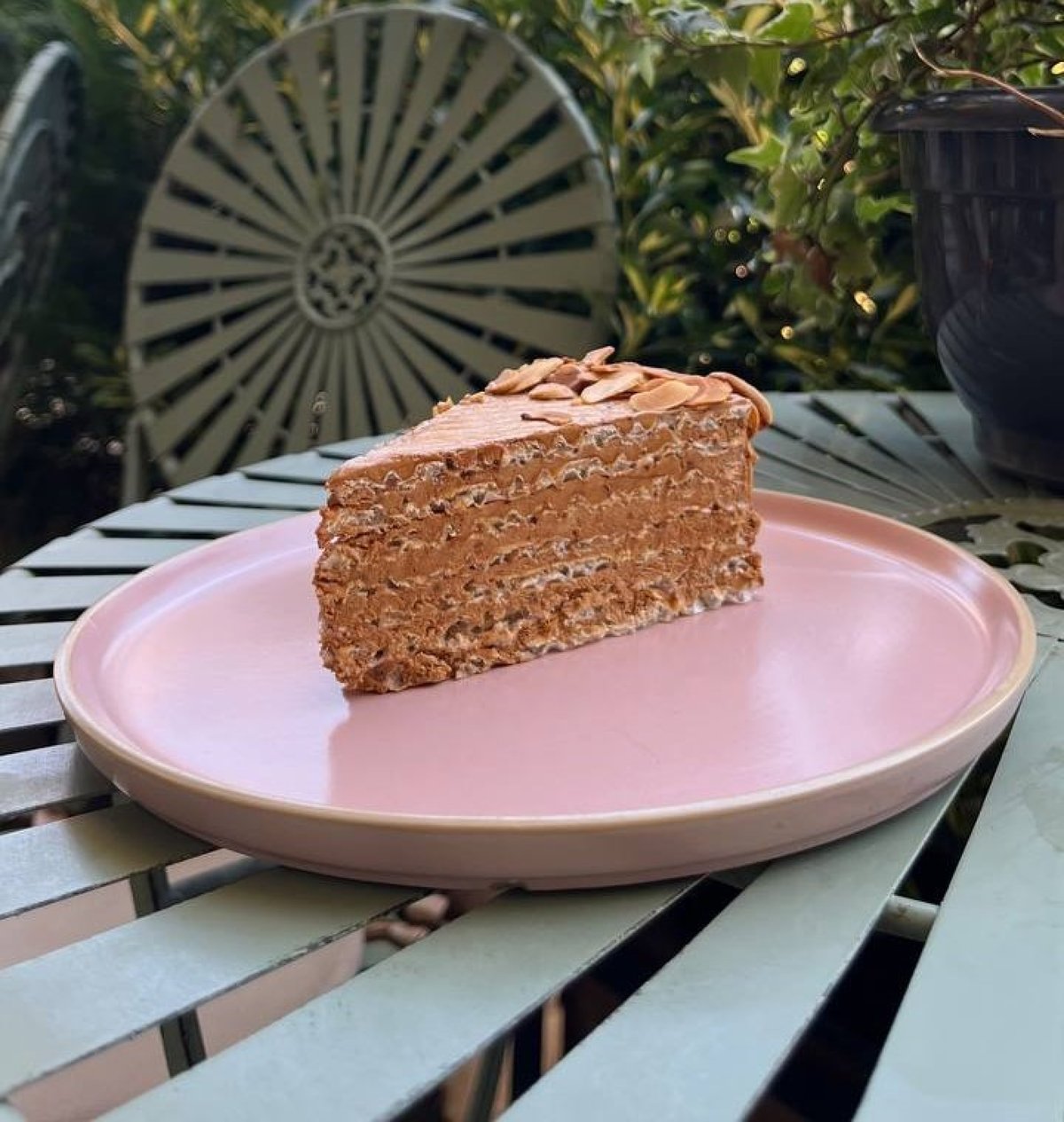 Red crepes 2 pc, sweet creem, strawberry, strawberry jam, almond flakes