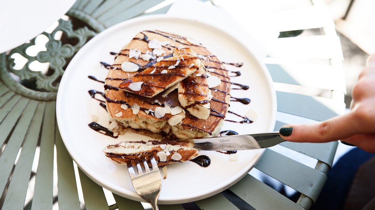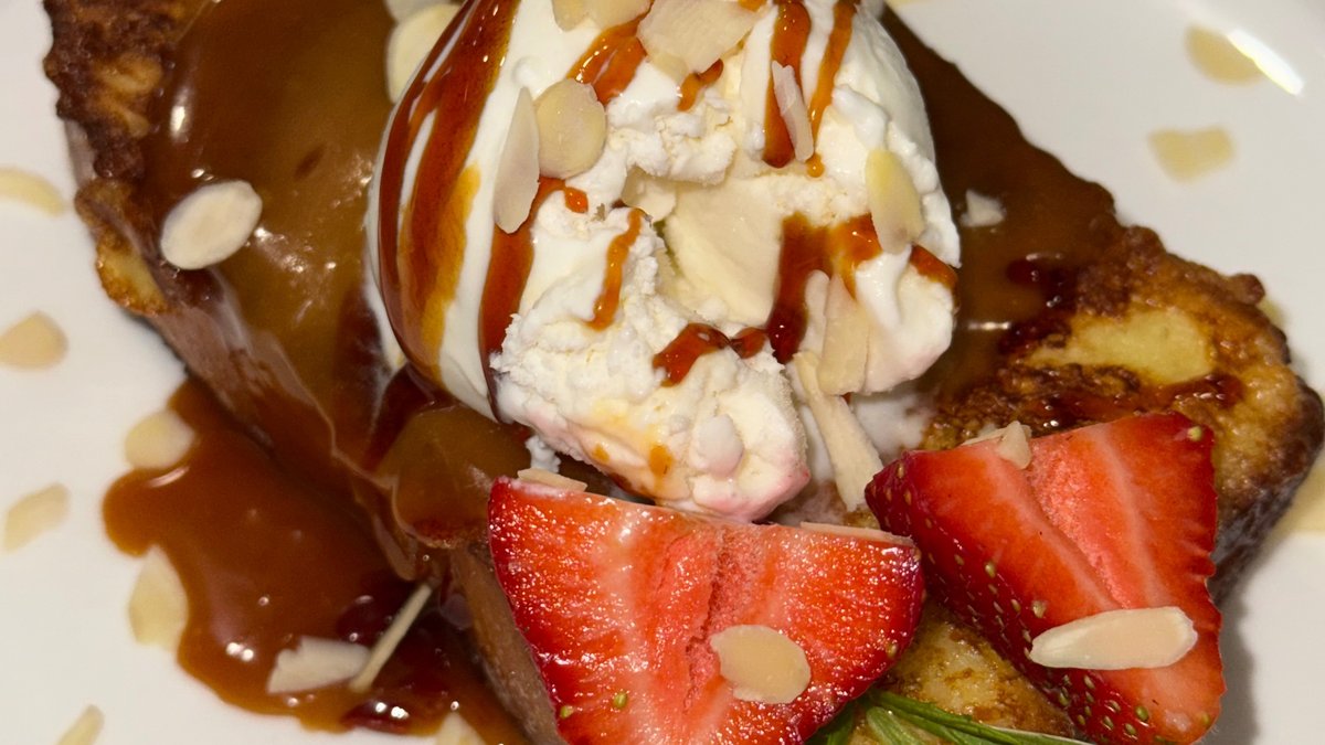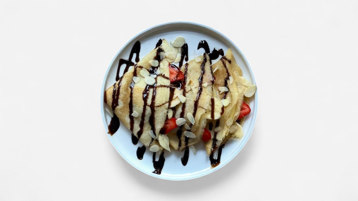 Crepes 3pc, banana, nutella, chocolate topping, strawberry, almond flakes