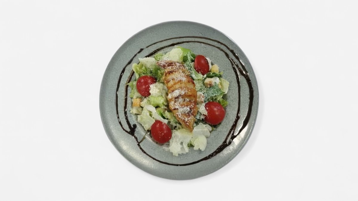 salad mix, chicken, sauce Caesar, croutones , parmesan, cherry tomatoes