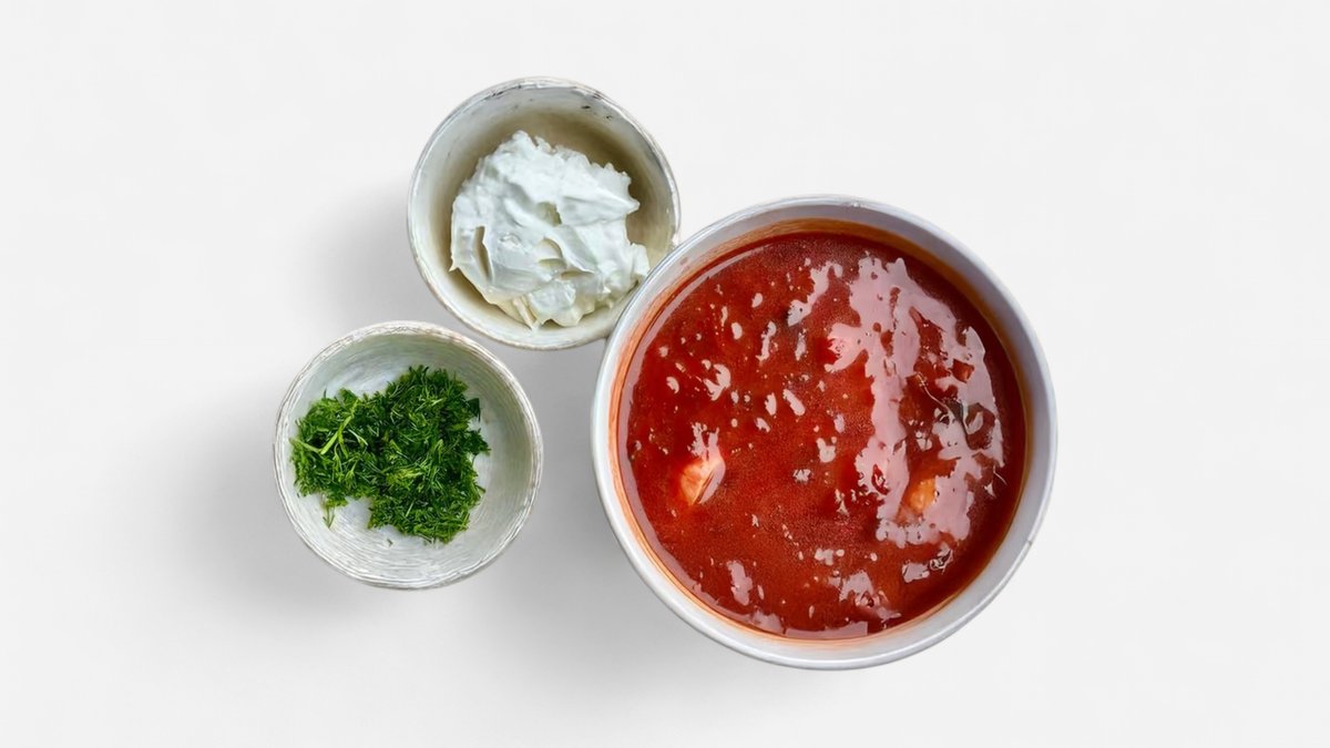 Potatoes, cabbage, onions, carrots, beets, chicken fillet, sour cream, bread