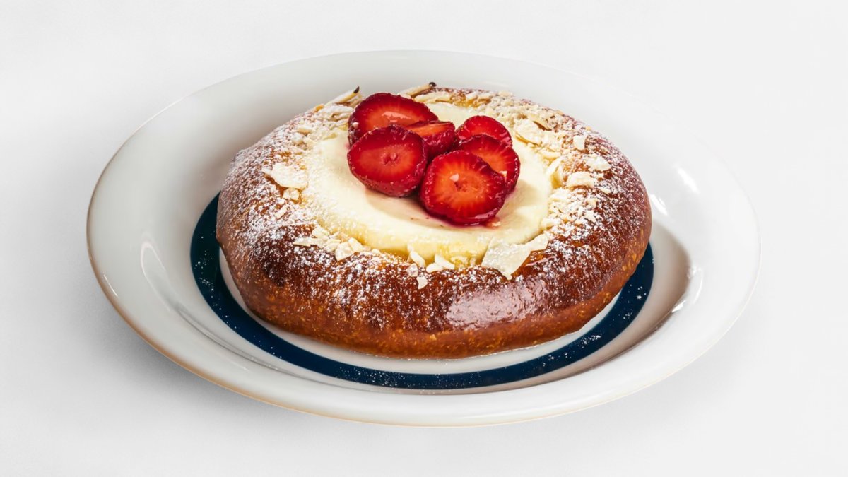 Smooth Vatrushka With creamy cottage cheese with strawberry topping and delicious mango under the filling.