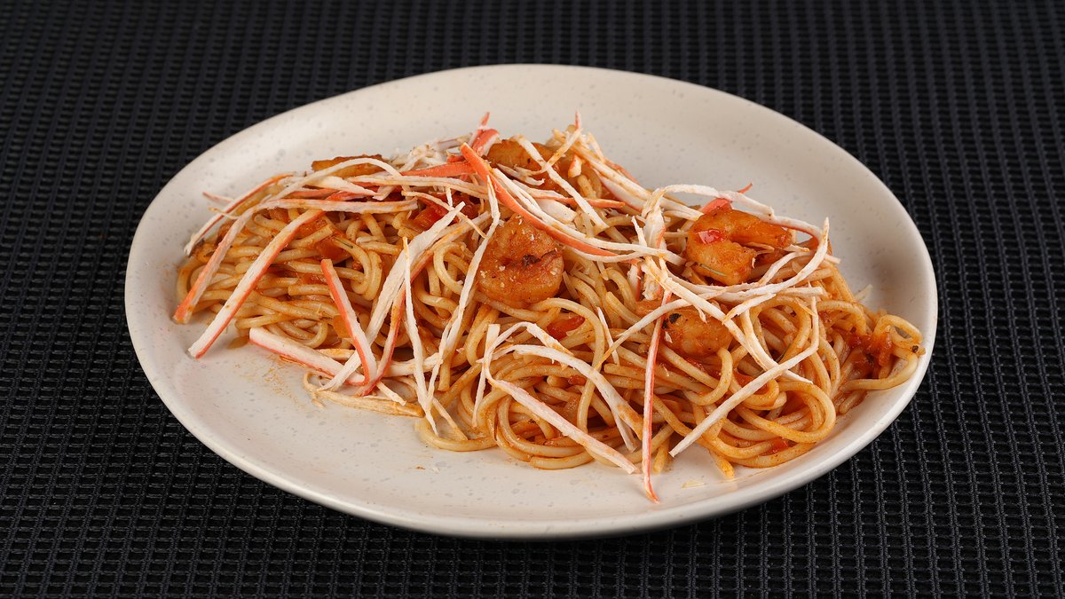 Shrimps, crab meat, onion, garlic, tomato sauce, capsicum