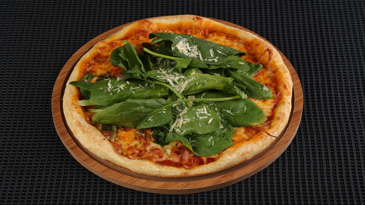 Pizza sauce, spinach, mozzarella cheese, parmesan