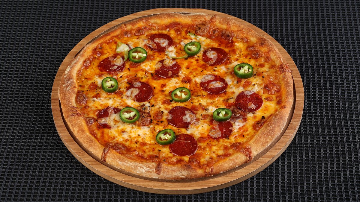 Pizza sauce, capsicum, spicy pepperoni, mozzarella cheese