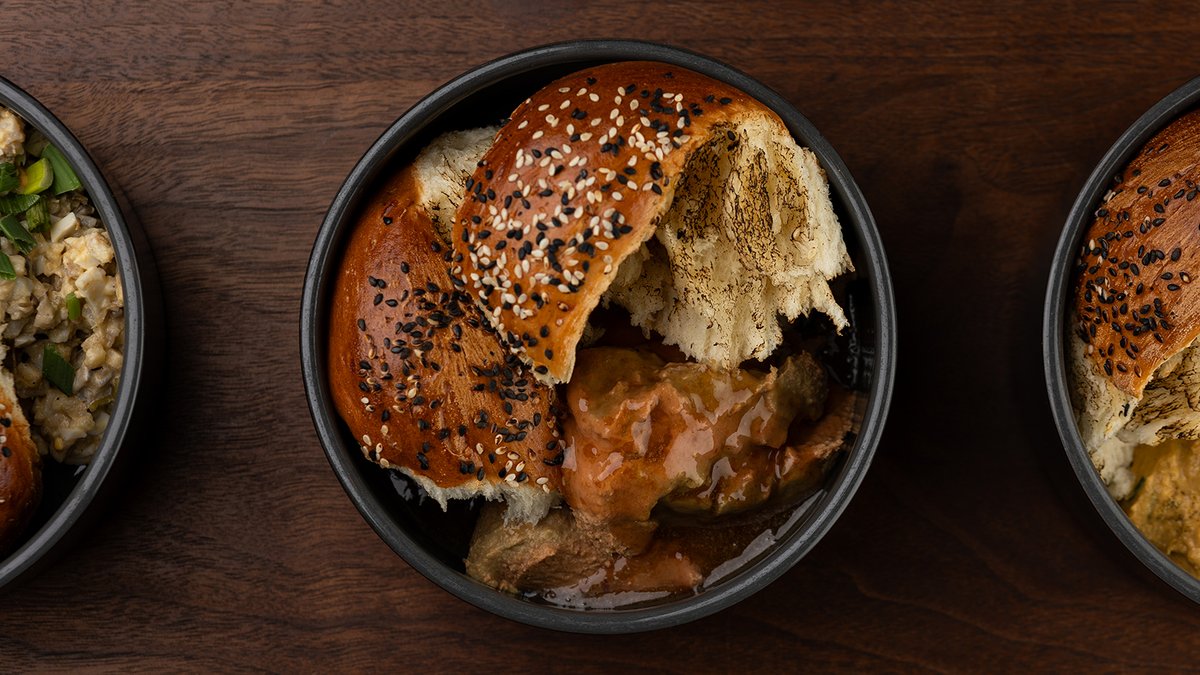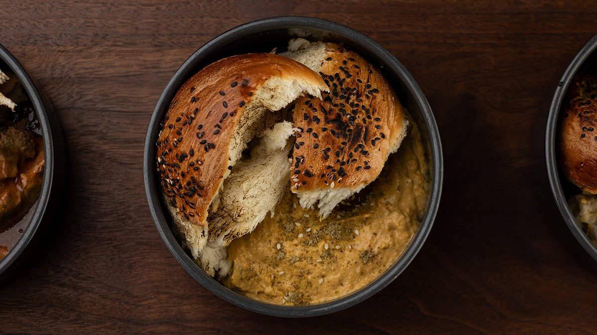 პიტა, ქათამი, ბადრიჯანი, ტკბილი პილპილი, მატბუხას სოუსი