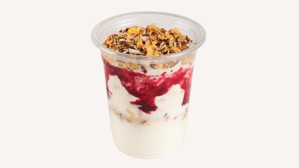მაწონი, მიუსლის მარცვლები, მარწყვის ჯემით