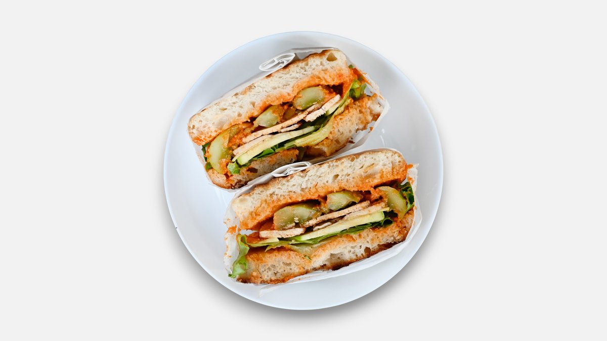 Sandwich With Tofu, Smashed Cucumber, Lettuce, Zucchini, And Sauce
