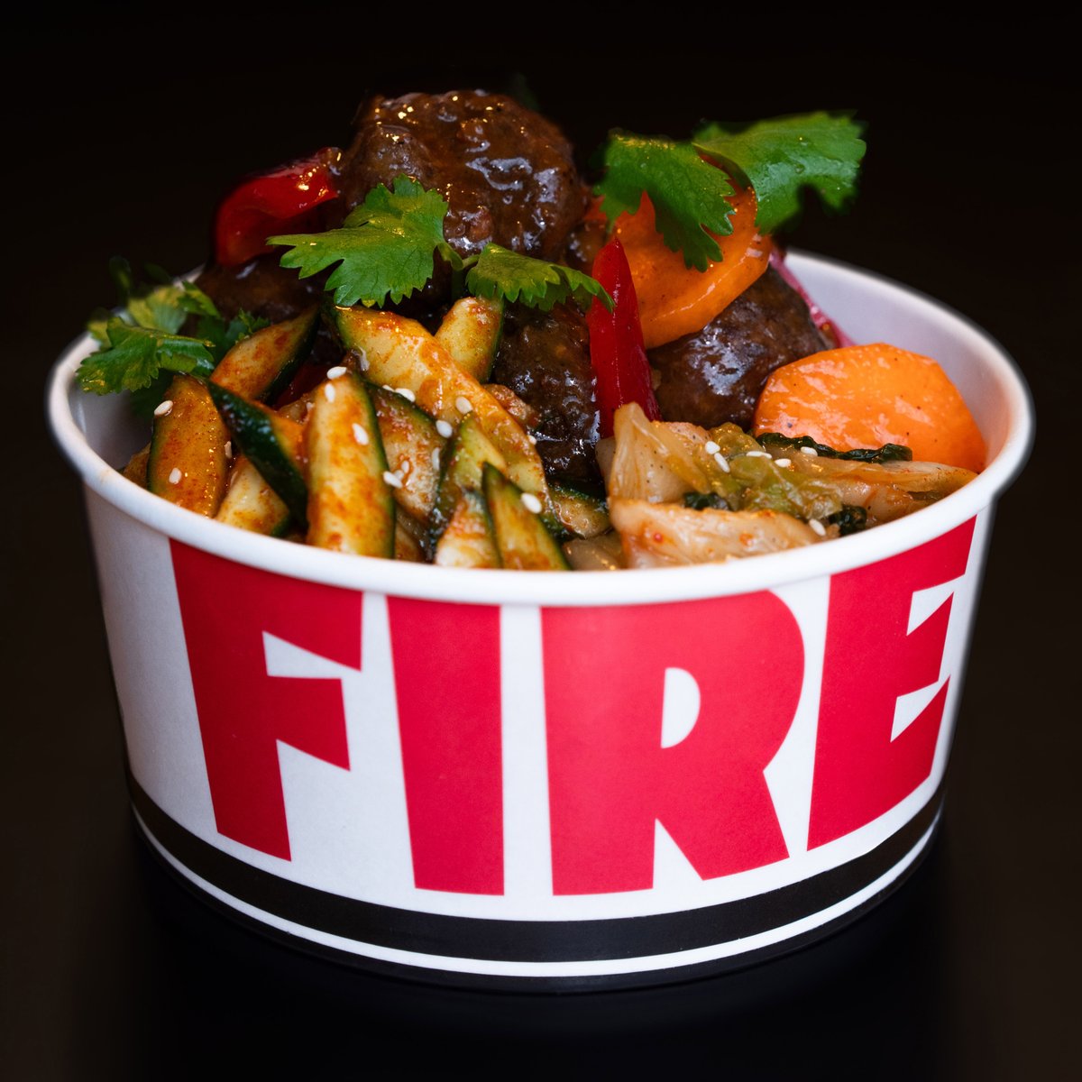 ASIAN STYLE -DEEP FRIED BEEF MEATBALLS, SAUTEE WITH CARROTS AND RED CAPSICUMS WITH GARLIC AND SAVORY SAUCE. SERVED WITH STEAMED WHITE RICE AND MILD-SPICY HOUSE CUCUMBER SALAD. THAT MIX OF SAVORY, MILD SPICY, THE FRESHNESS OF VEGGIES AND THE CRIPS OF MEATBALLS WILL SATISFY YOUR CRAVINGS FOR ASIAN FLAVORS. Ingredients: white rice, bell peppers, carrot, cucumber, garlic onion, sesame seads, ground beef, coriander