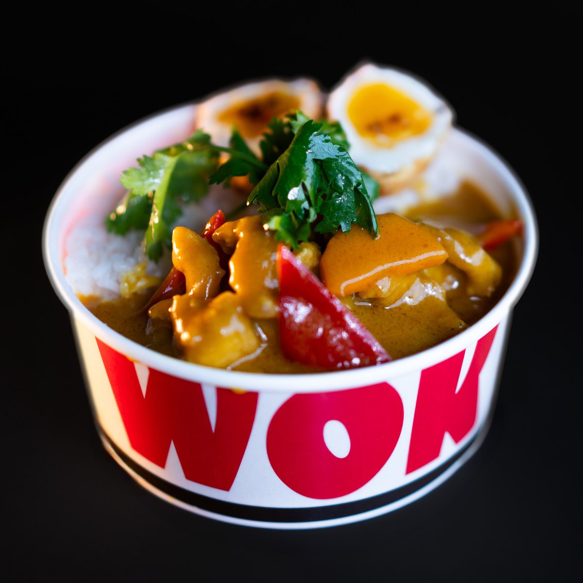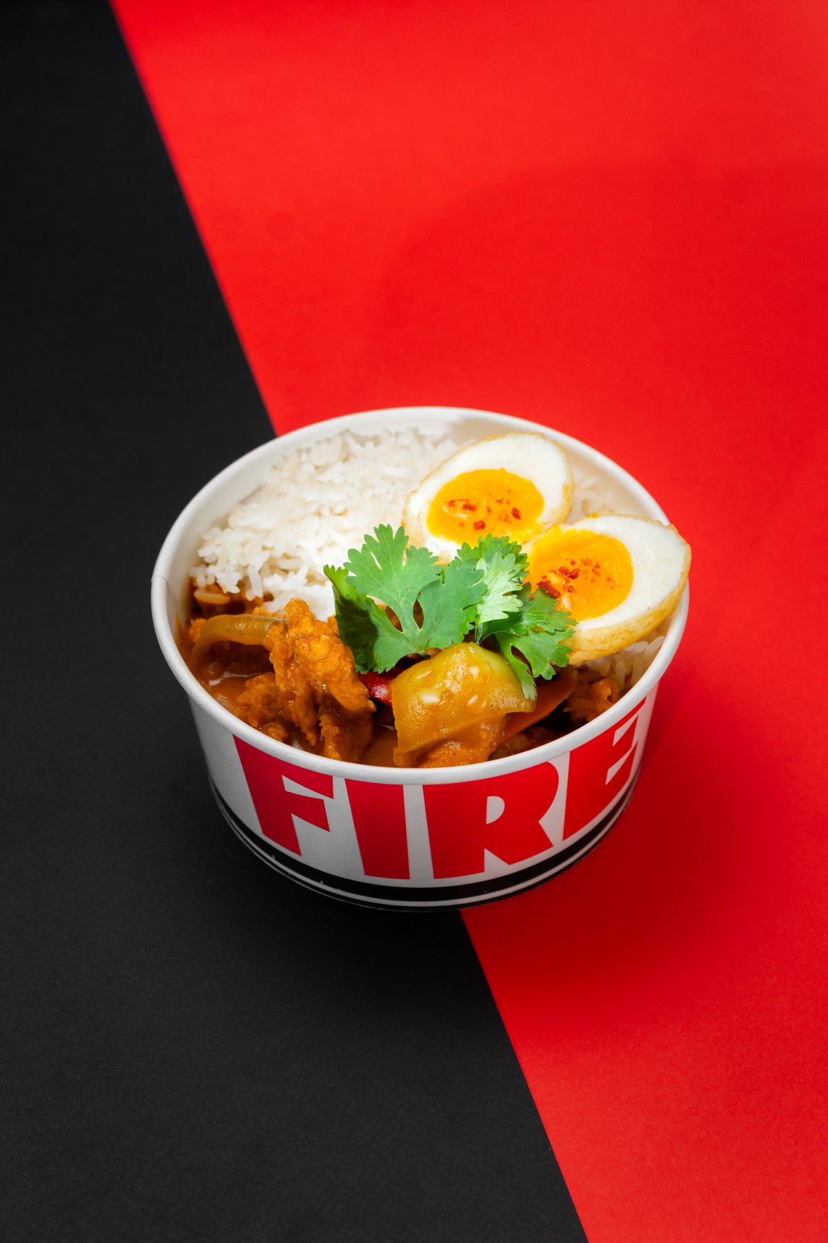 Coated Deep Fried Chicken Tenders Sautéed with Capsicum and Simmer in Mild Spicy Yellow Curry and Coconut Cream Sauce. Topped with Soft Boiled Fried Egg and Coriander Leafs. Served with Steamed White Rice