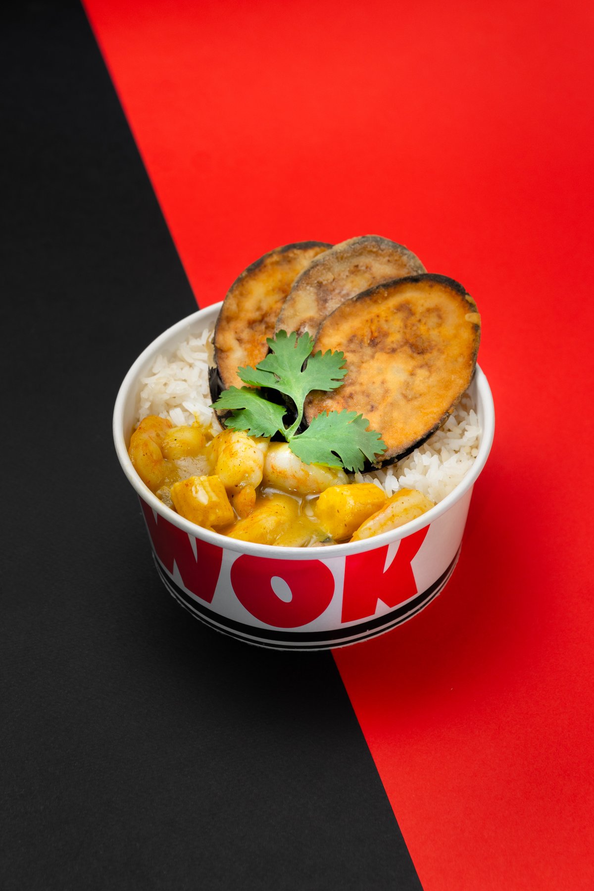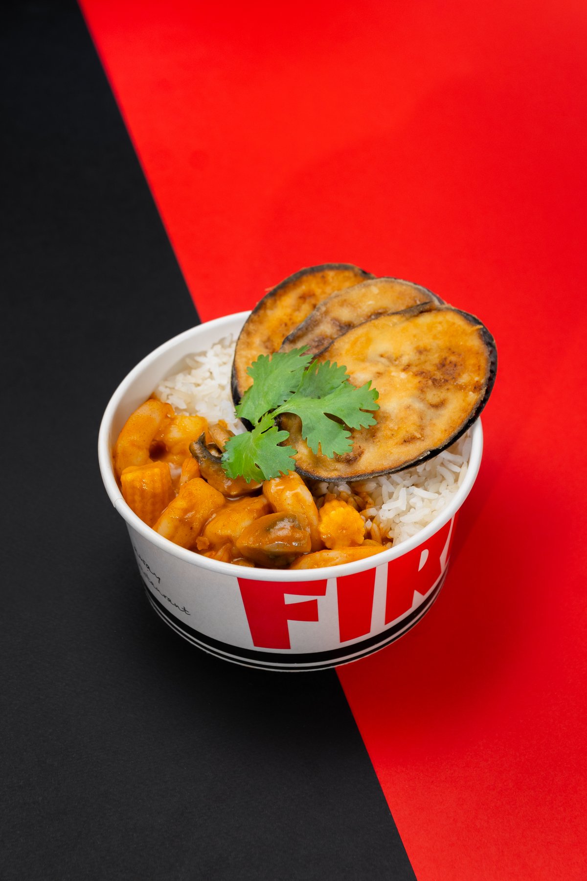 Shrimps, fried mushrooms, fried eggplant. Spicy red curry sauce with coconut milk. with steamed white rice