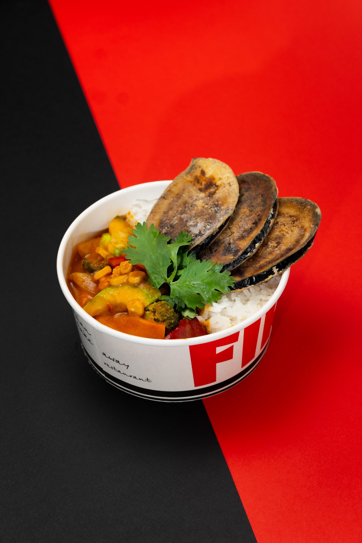 Broccoli, cauliflower, zucchini, corn. Spicy red curry sauce with coconut milk. garnished with fried eggplant and coriander leaves, served with steamed white rice