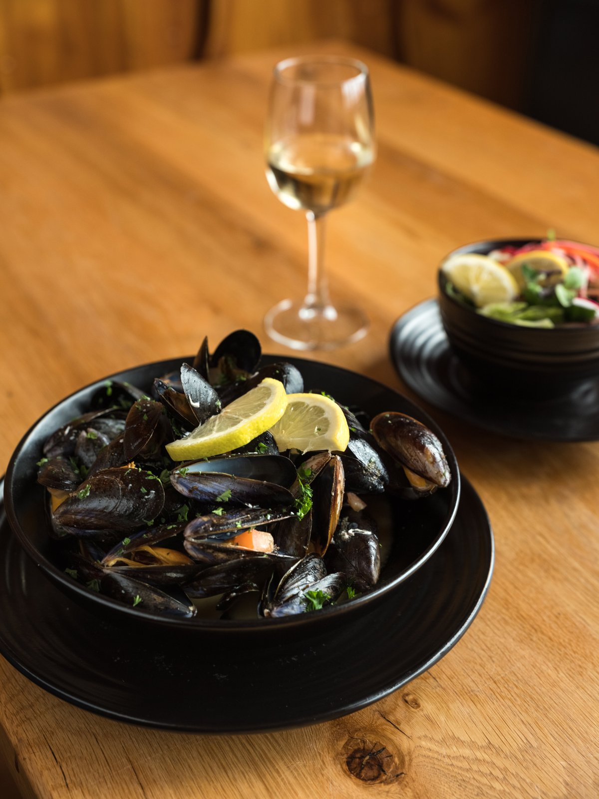 შავი ზღვის მიდიები თეთრ ღვინოში, ხახვით და ნივრით, 400გრ
