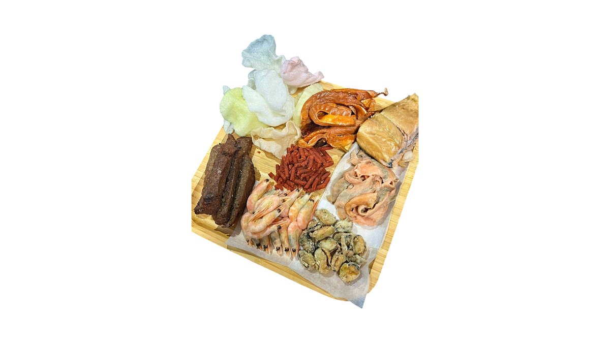Set for 2-4 person. Ingredients: Croutons 150 gr Shrimp chips Vanamei shrimps boiled frozen 150 gr Dried coho salmon strips 50 gr Fried mussel fillets 100 gr Salmon shavings 100 gr Smoked bellies 100 gr Hot smoked salmon 100 grIf one of the components of the set is not available, it will be replaced with a similar one, or another one of no lesser price.