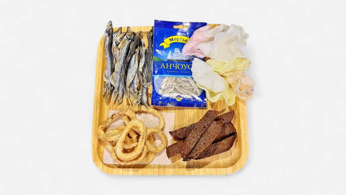 "Small set for 1-2 person. Ingredients: Dried capelin 100 grams, Dried anchovy 18 grams, Breaded squid rings 150 grams, Garlic rye bread croutons 100 grams, Shrimp chips."If one of the components of the set is not available, it will be replaced with a similar one, or another one of no lesser price.