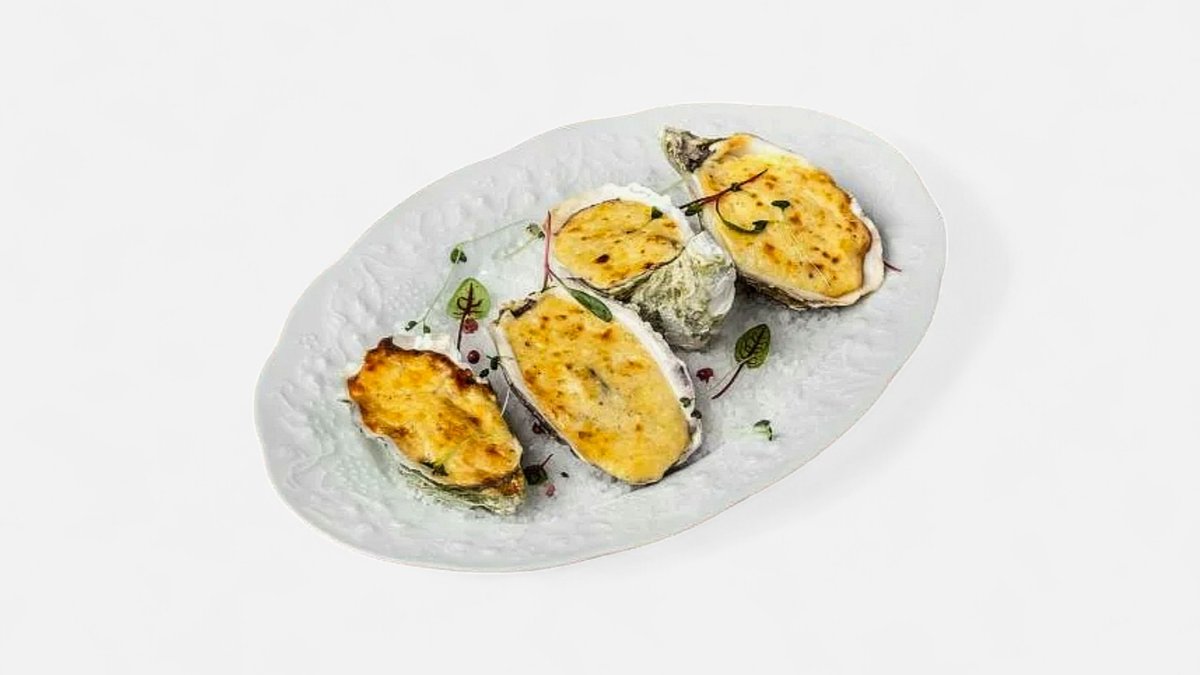 Delicate Fines de Claire oysters baked with a creamy topping of cheese, sour cream, garlic, and a touch of soy sauce. A refined harmony of ocean freshness and gentle spice — a gourmet delight.