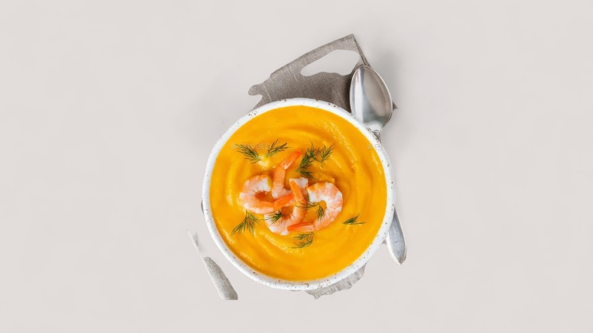 Pumpkin cream soup with onions, garlic, salt, pepper, turmeric, coconut milk, Sriracha sauce and shrimps.