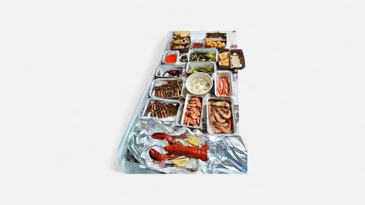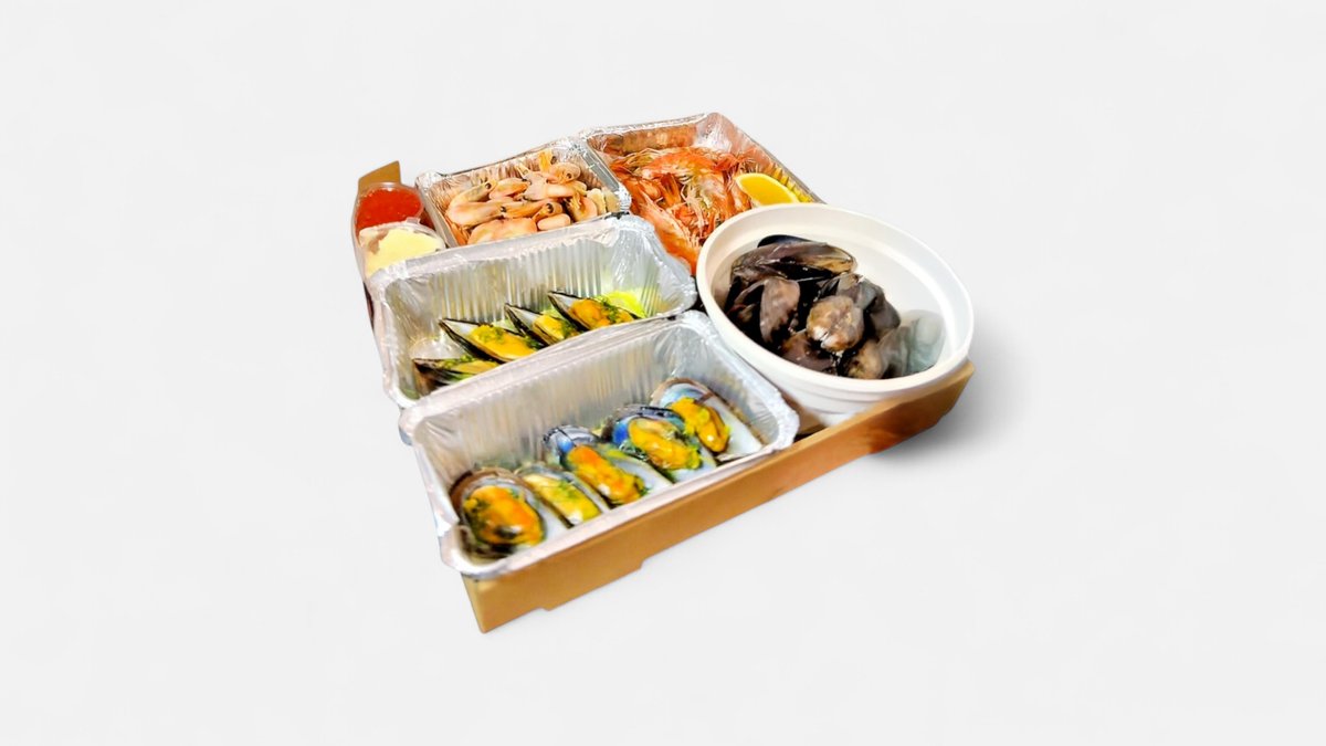 Ingredients: Red caviar 80g, Black caviar 30g, Whole shrimp 400g, Vanamei shrimp 300g, Lobster 1pc, Eel 500g, Breaded squid 300g, Tempura shrimp 300g, Scallops 300g, Opilio fillet 200g, Half-shell mussels 300g, Octopus tentacles 1 pack, 2 servings Bread and a measuring cup with butter. The product is ready to eat.